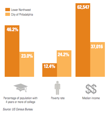 Central Roxborough is located within the Northwest District. Here housing trends exhibit owner-to-renter-occupied housing units. The Lower Northwest has an above average housing occupancy rate and a below average vacancy rate. Between 1980 and 2010, the renter occupancy rate increased from 37.1% to 44.4%. Despite a sizable college-aged population, data show that only 2.5% of the population lives in group quarters. The lack of student dormitories creates more demand for rental units in the district.