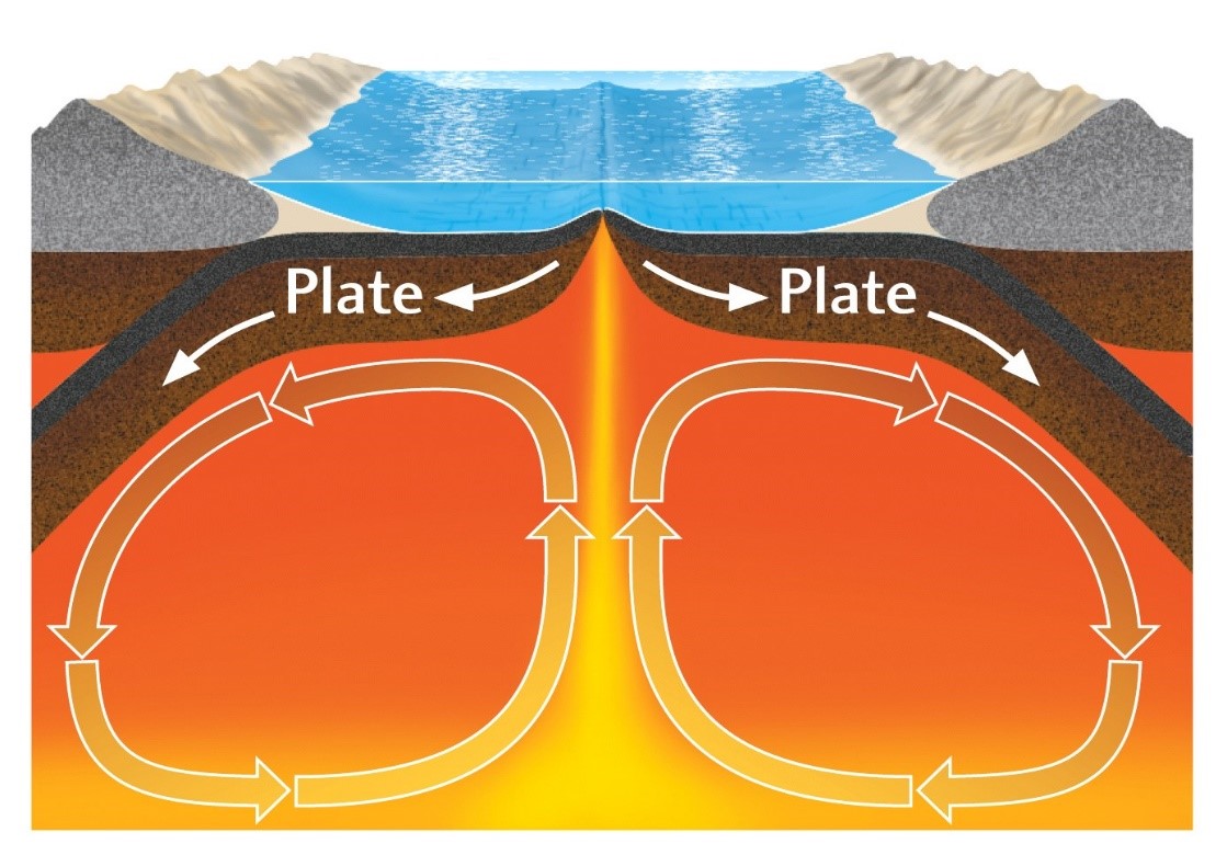 when two plates separate and create new oceanic crust, a divergent plate boundary forms. this process occurs where the seafloor spreads along a mid-ocean ridge, as shown to the right. This process can also occur in the middle of continents and is referred to as a continental rifting.