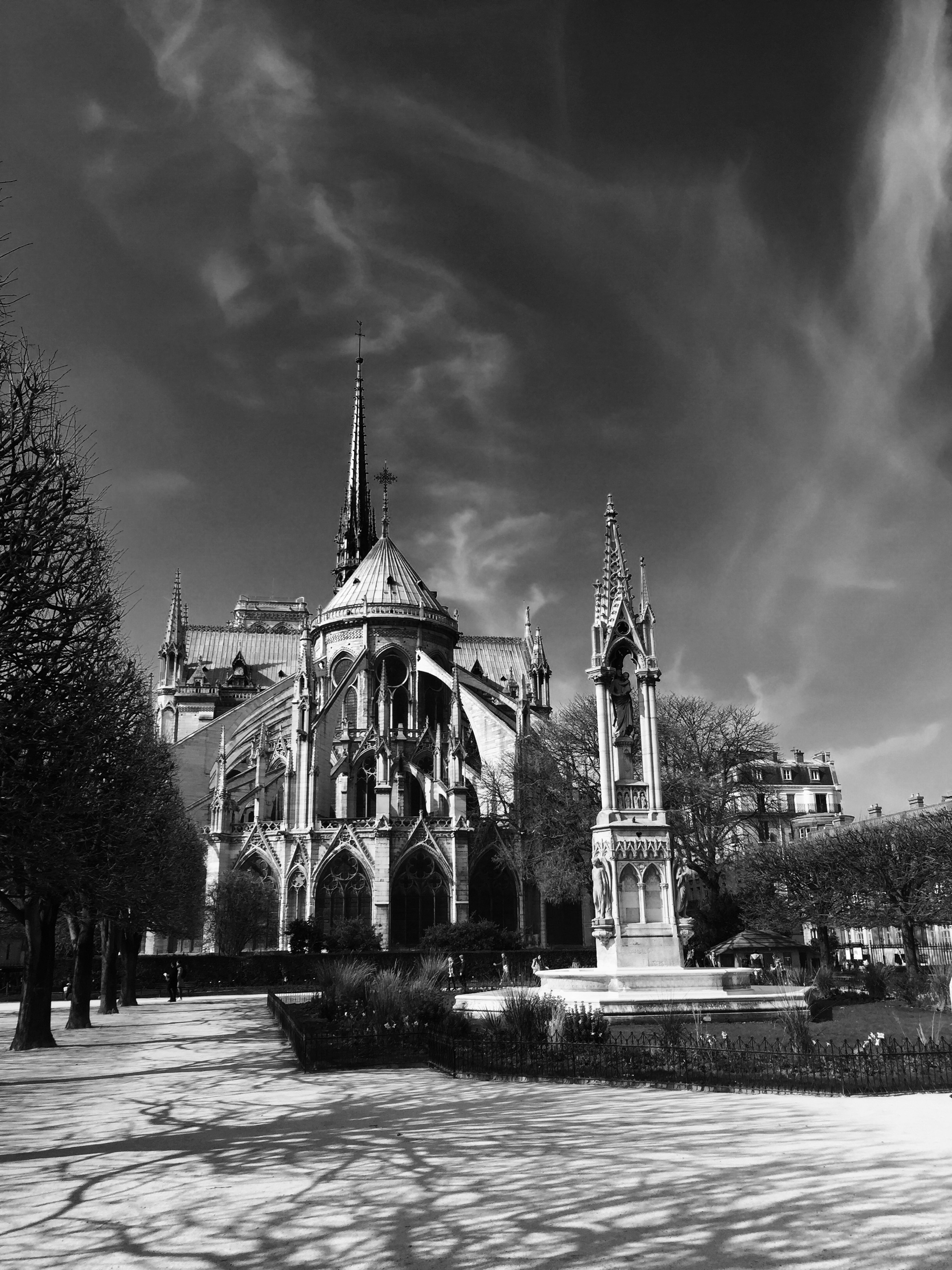 Round the back of Notre Dame is this garden and it's still early spring so no leaves but everything looks nice anyway and I take a fairly throwaway shot of the rear of the cathedral. Fast forward to a few hours later and with one single click of a tweak (the "noir" filter, I think) I am staring at a photo I think might be one of the best I've ever taken. Here, have a look.