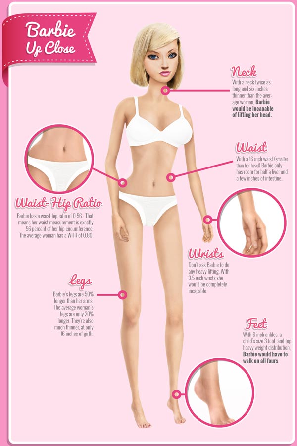 If Barbie dolls were made into a life sized real human being their body portions would make them unable to survive. The Barbie dolls neck is twice as long and 6 inches thinner then the average women, making it impossible for a Barbie doll to lift its heads. The waist of a Barbie doll is 16 inches, which only leaves room for half a liver and a few intestines. A Barbie dolls feet are made to be a child’s size 3, causing a Barbie doll to have to walk on all fours. A Barbie dolls wrists are 3.5 inches and would be completely incapable of doing anything. A Barbie dolls legs are 50% longer then her arms.