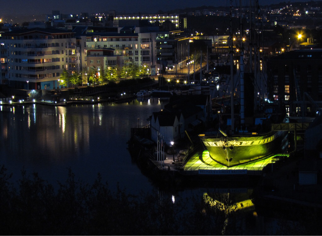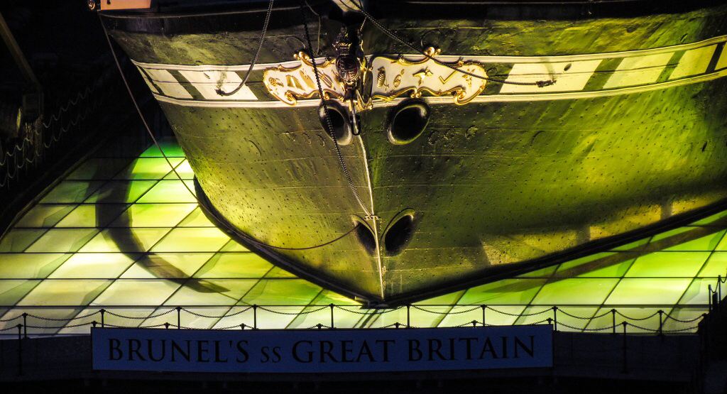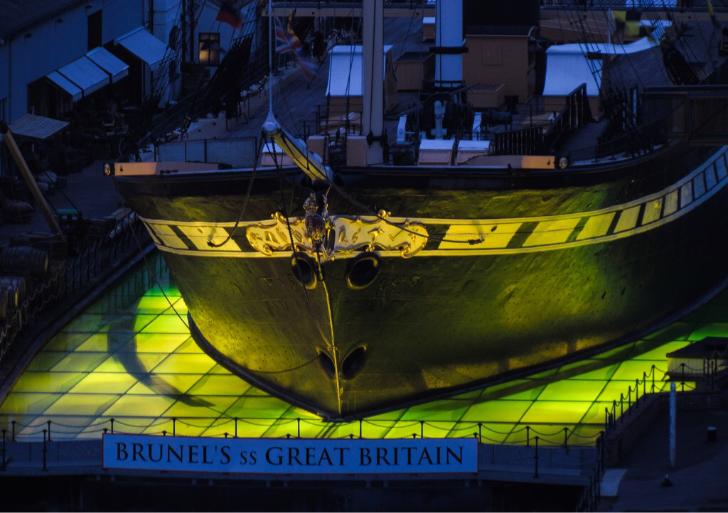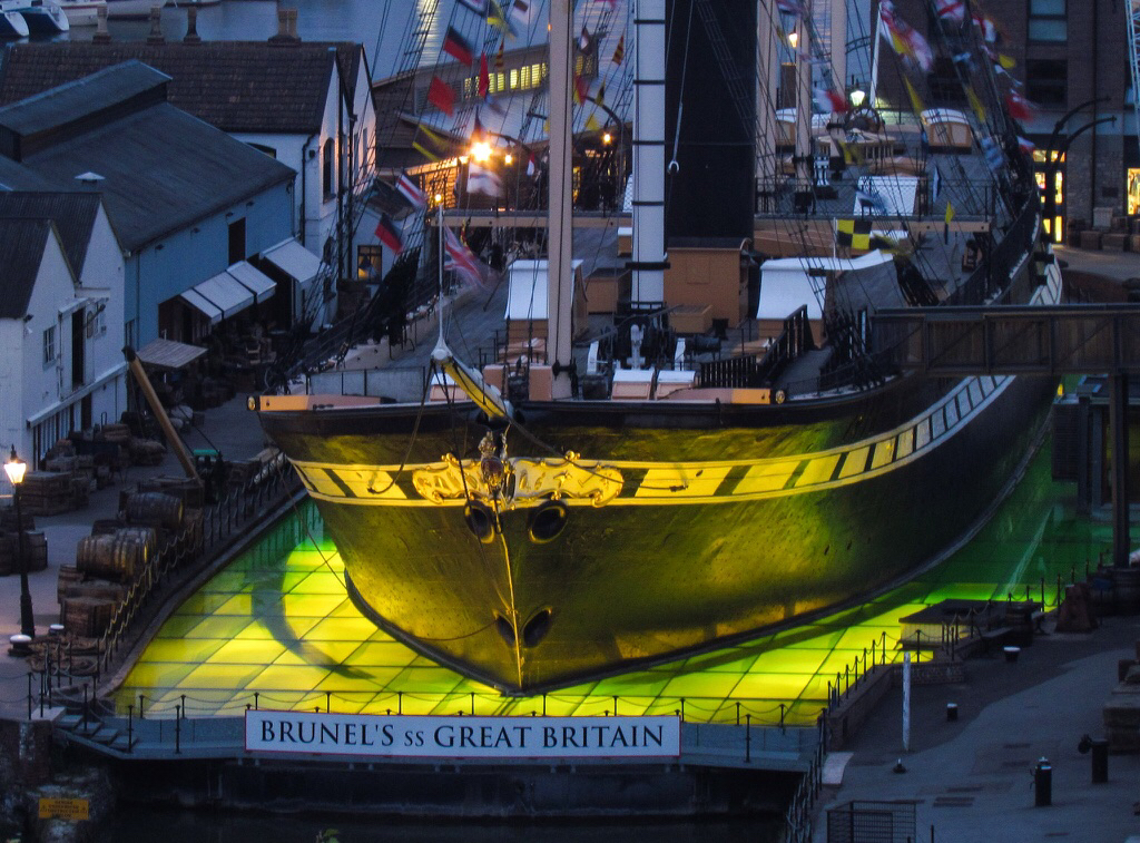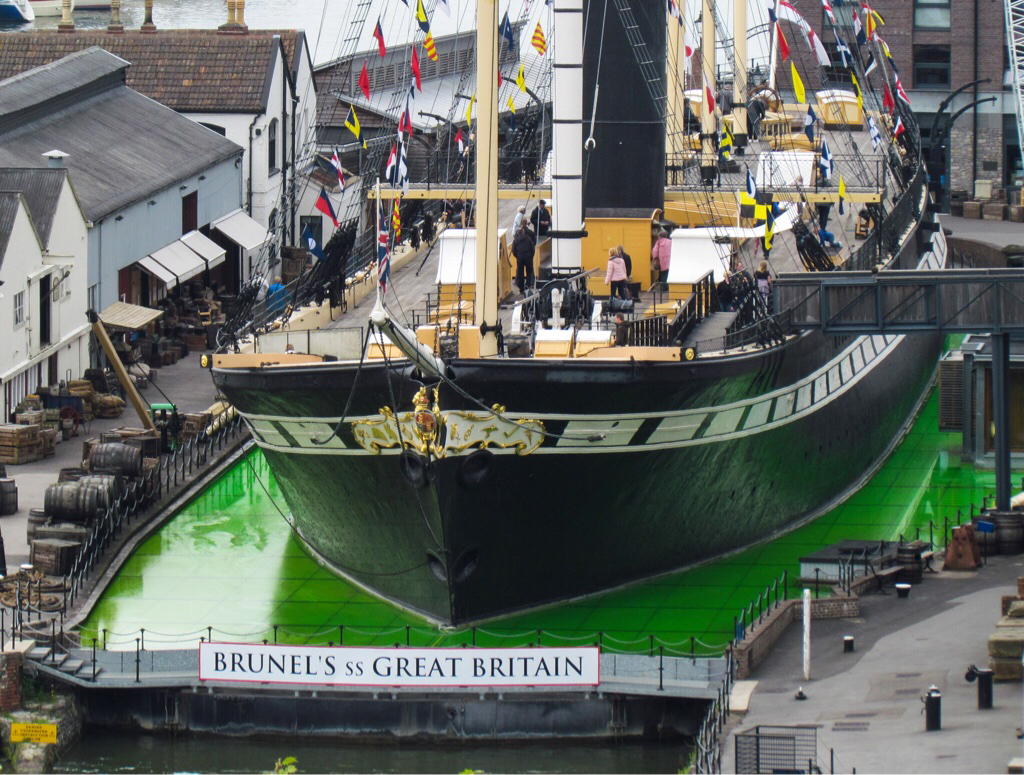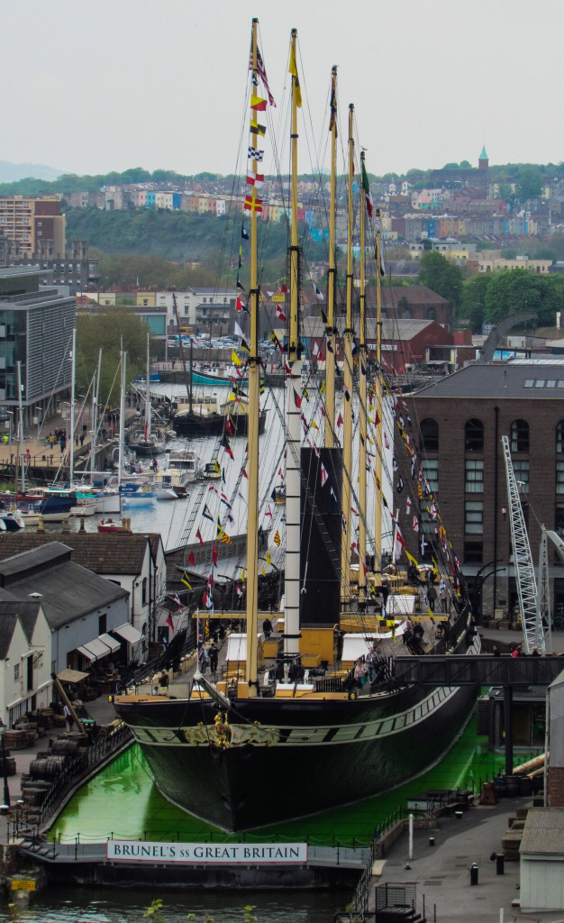 In the foreground is the SS Great Britain, Brunels famous ship. Bristol is home to many of his historic achievements including the Clifton Suspension Bridge and the Great Western Railway.