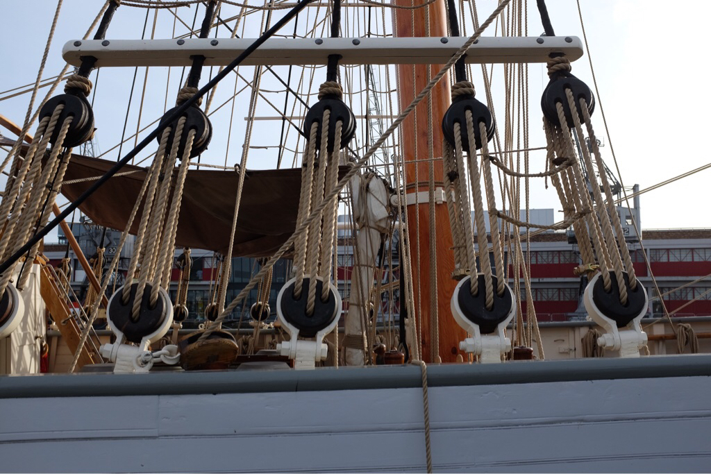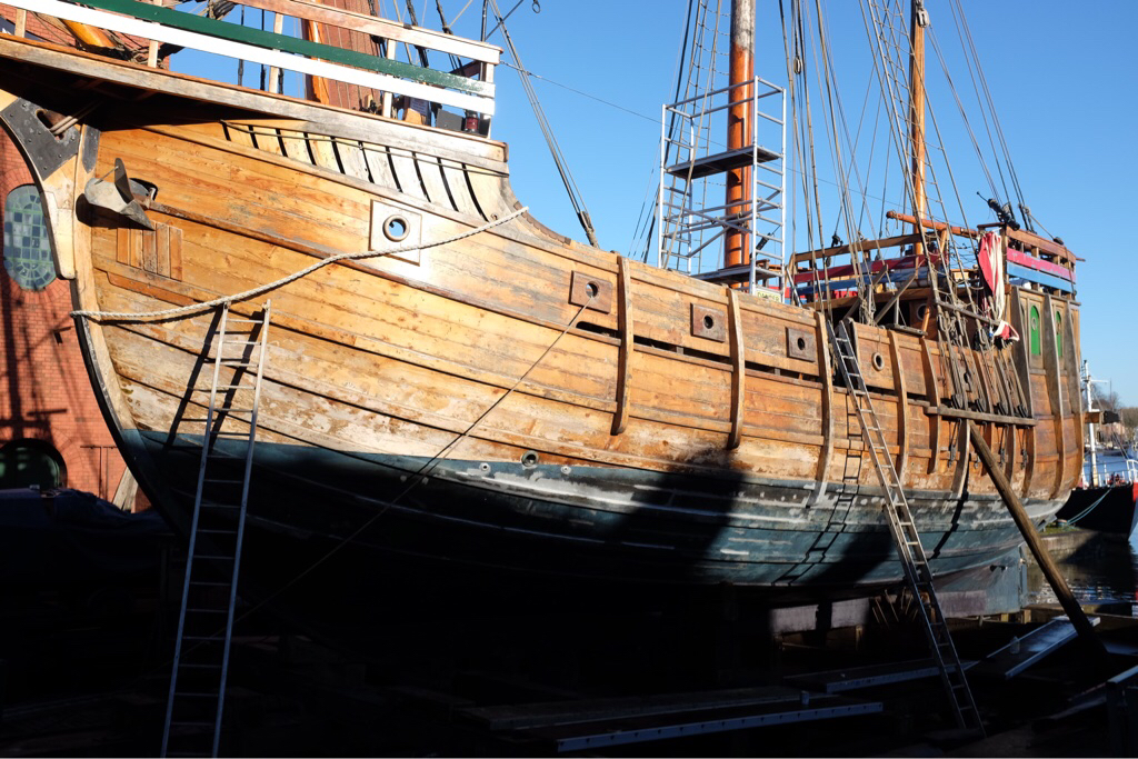 The ship is actually in a dry dock, a glass plate has been placed at the waterline and a small quantity of water is on top, from above it looks like it is water, but you can walk underneath! A couple of years ago the ship was surrounded in Jelly and lit from underneath, the effect was stunning!