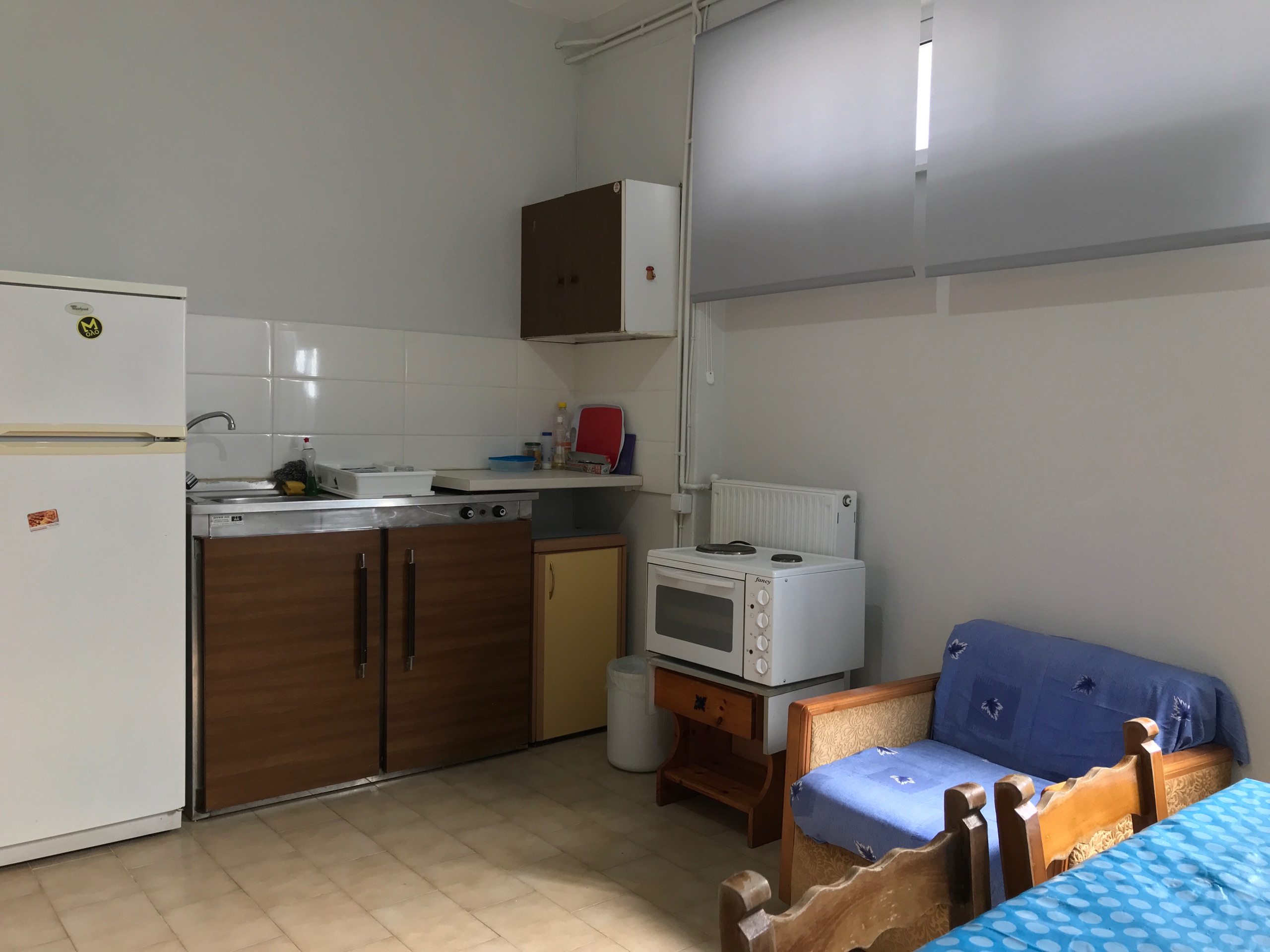 Kitchen is equipped with fridge, an oven for basic cooking, cooking utensils, instant coffee maker, water boiler, cups, glasses, knives, spoons etc.