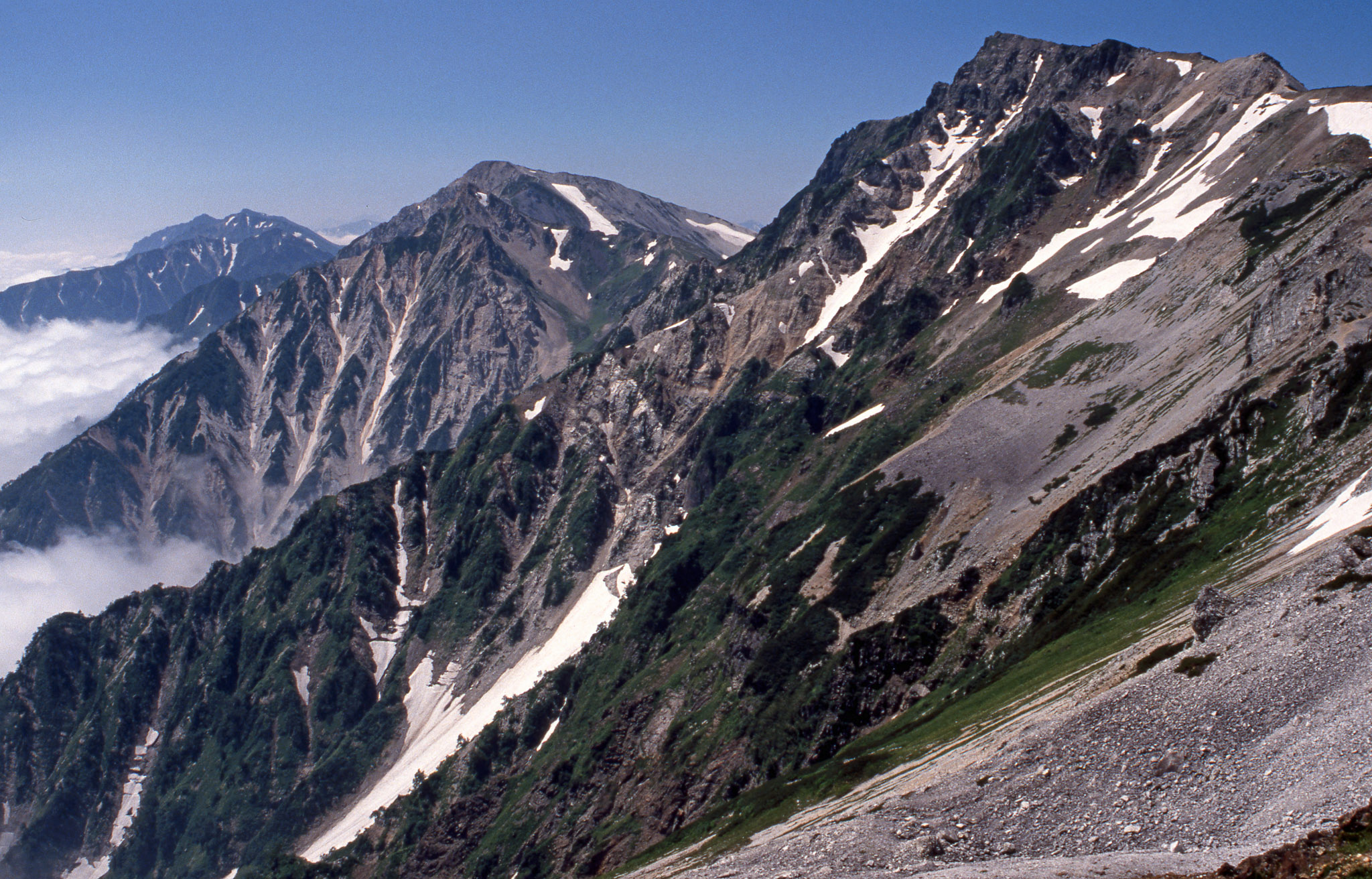 北側から望む白馬三山。右の頂上が白馬岳。その左に杓子岳と白馬鑓ヶ岳が重なっている。三山の東側斜面は急峻な山容をしている。