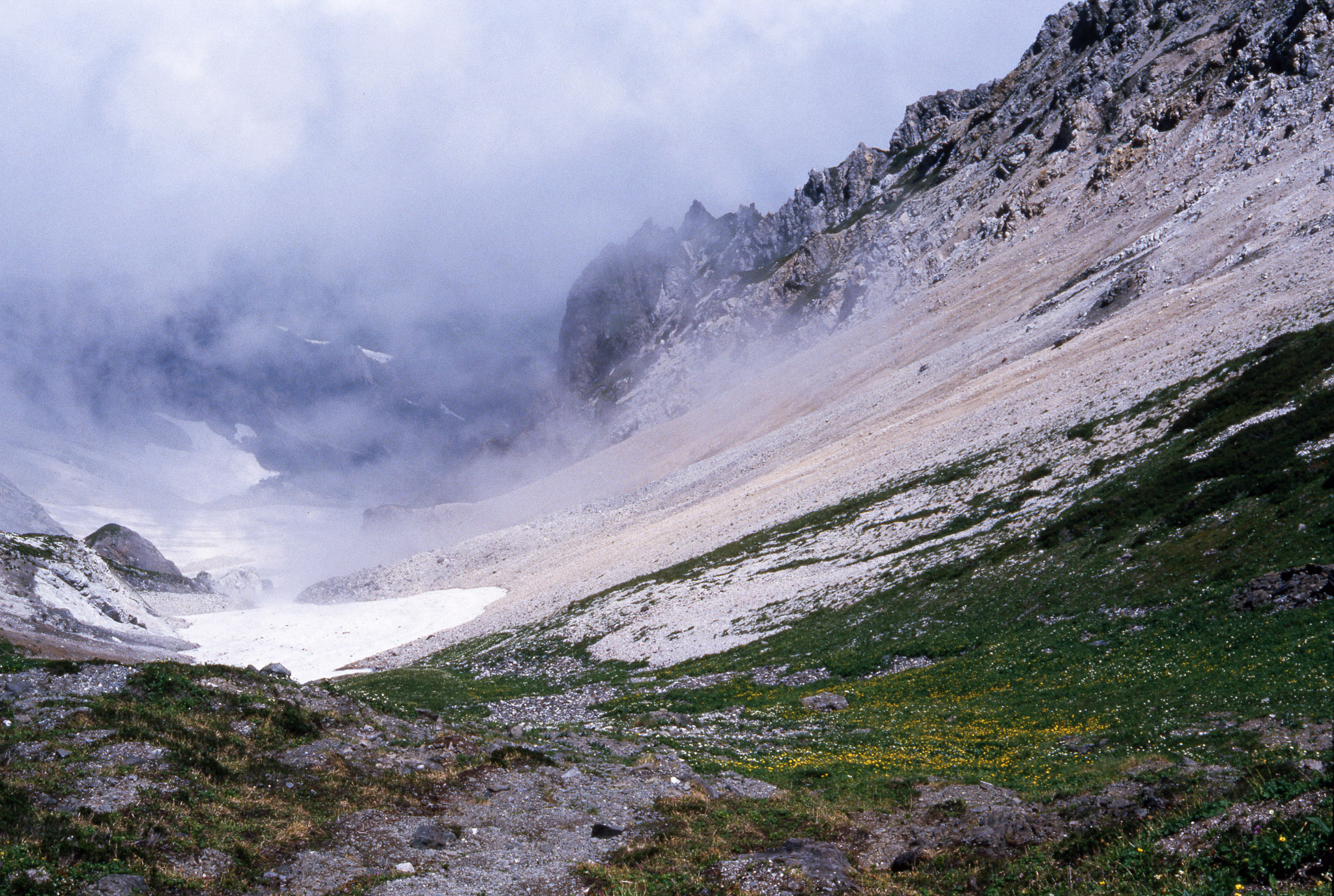 白馬大雪渓の上部にあたる場所。右側の杓子岳の裾野は常に崩れ続けている。その手前の比較的安定した場所にはミヤマキンポウゲなどの植物が生えている。