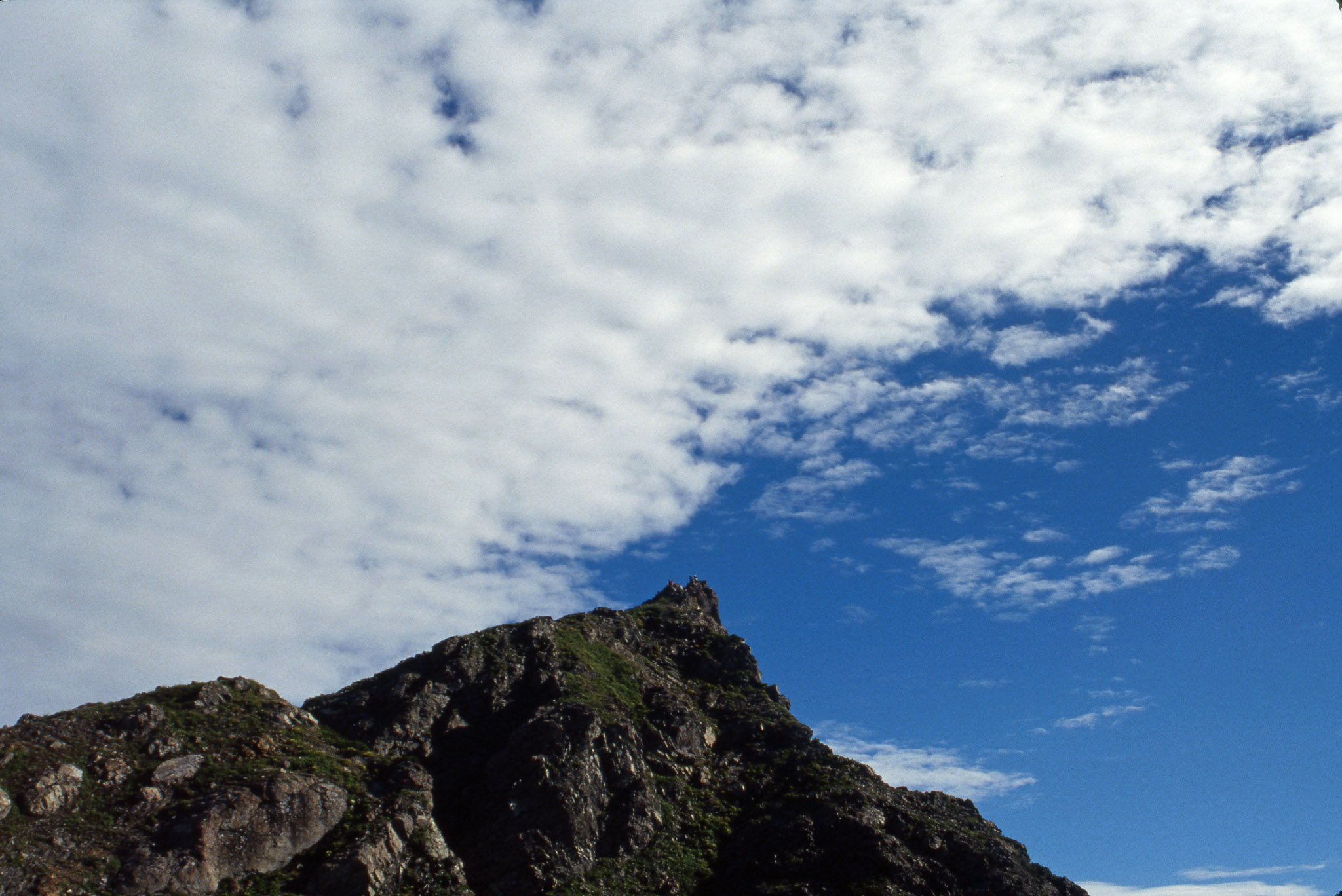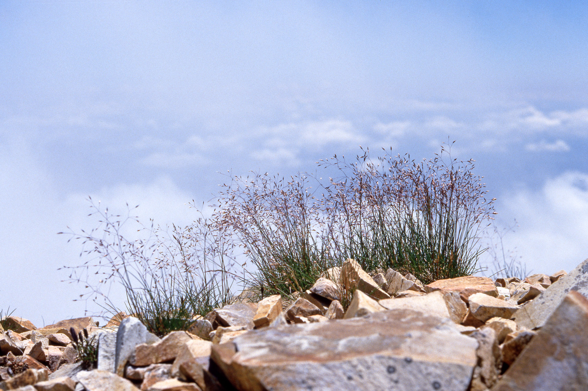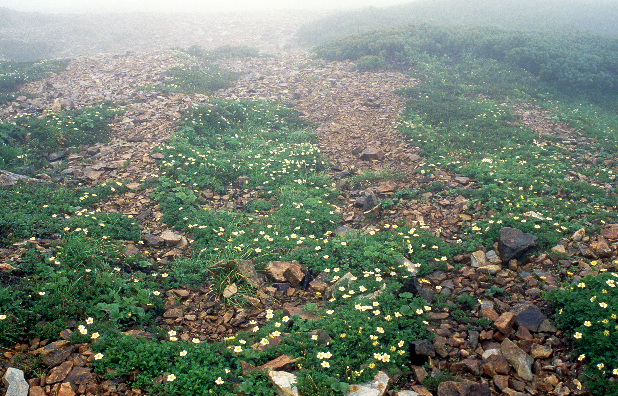 稜線に出る。ガラガラとした岩や石が転がる尾根が続く。天気がよい日は日差しが直接あたる。一方で冷たい雨の日もある。体が持っていかれそうなほどの風が吹く日もあれば、ガスに閉じ込められる日もある。稜線は全ての天候に直接さらされる厳しい場所だ。そんな場所でも高山植物は岩の隙間に根をおろし、花を咲かせている。
