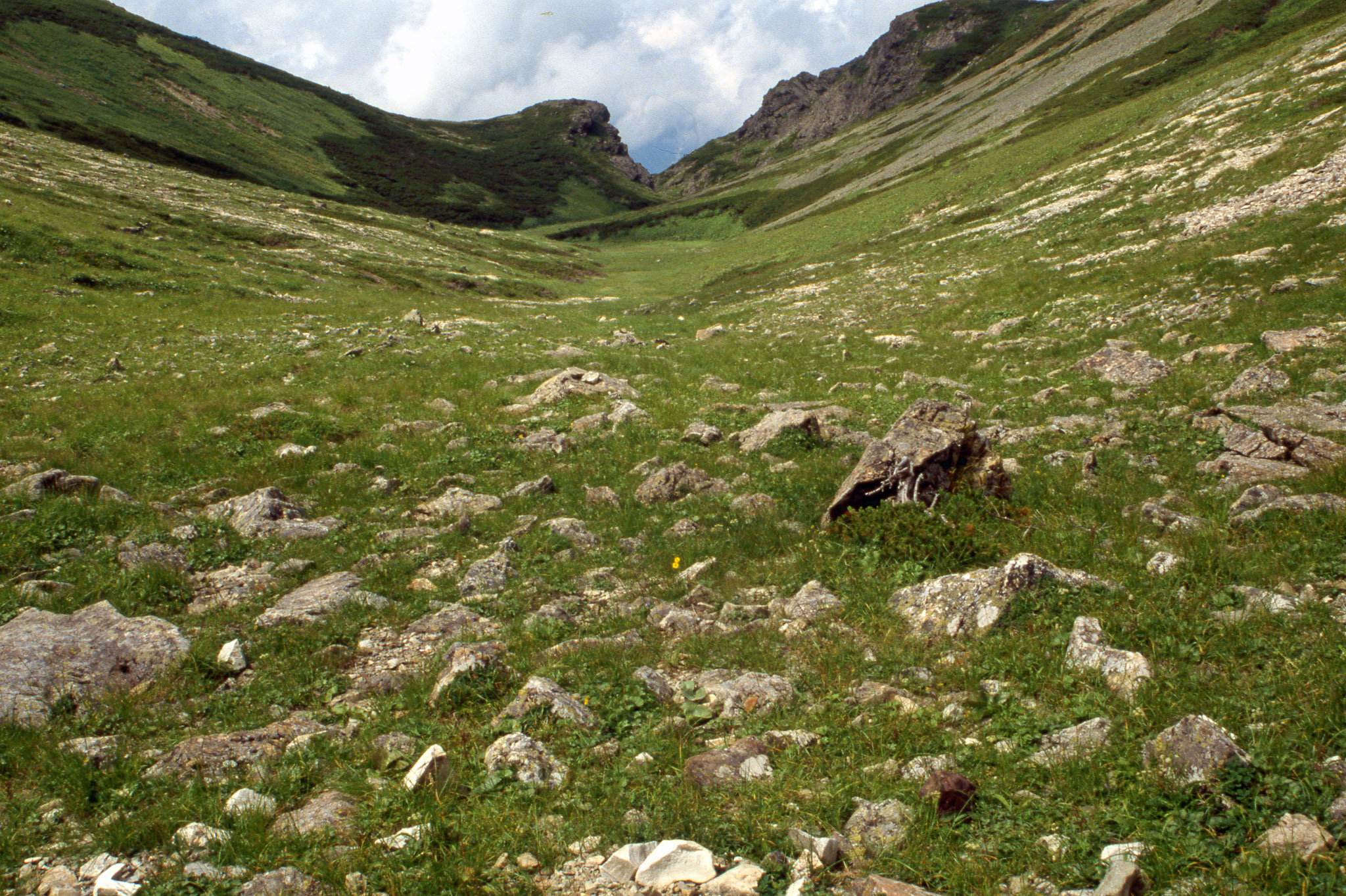 岩の陰の草地に群生していたコバイケイソウ。コバイケイソウは数年おきに当たり年(多い年)があるようで、この写真は多分その当たり年にあたっていたのだろう。少ない年には寂しいくらいにしか花がないこともある。