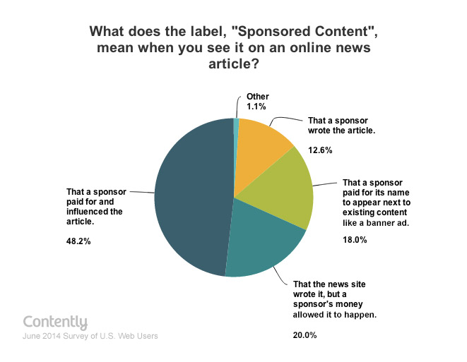 According to a survey conducted by Joe Lazauskas of The Content Strategist, people are pretty confused about the definition of sponsored content. "While a plurality (48 percent) of respondents believe that 'Sponsored Content' means that an advertiser paid for the article to be created and had influence on the article’s content, more than half (52 percent) thought it meant something different." Additionally, two-thirds of readers claim to have felt deceived after realizing that an article or video was sponsored by a brand while 59 percent of readers believe a news site loses credibility if it runs articles sponsored by a brand.