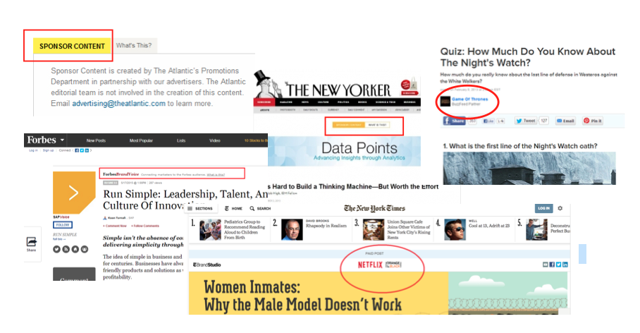 Sponsored content exists when an advertiser pays a publisher to have its name and/or message paired with a particular story. Sponsored content is often also categorized under native advertising, which is when ad content matches the form and function of the platform upon which it appears. Native advertising is the new term for “advertorials,” or advertisements disguised as editorial content. This method has been used for nearly 50 years with the intention of companies to disguise an advertisement as a true editorial endorsement or testimonial but is gaining more attention now as digital marketing techniques become more and more disguised.