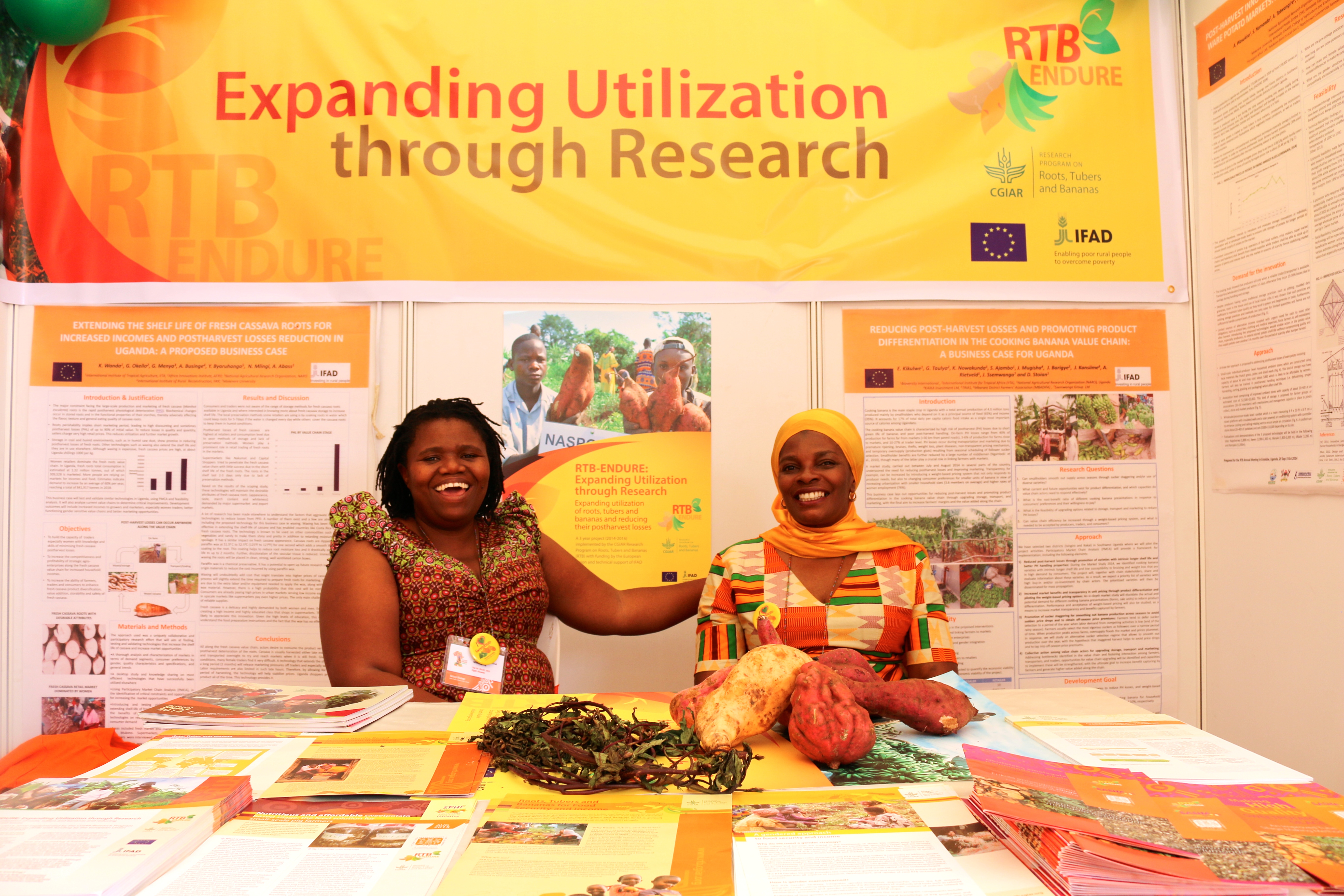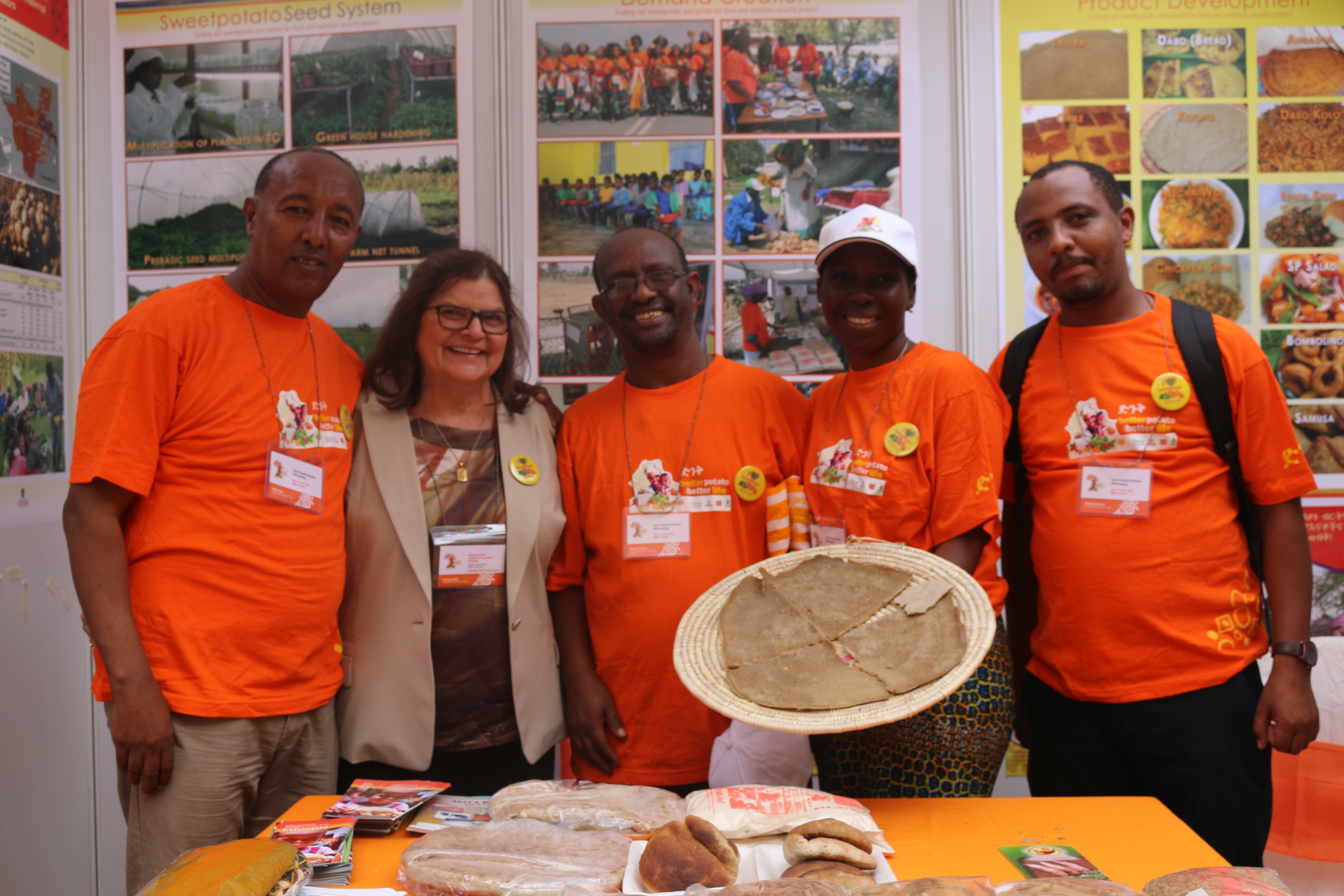 Orange-fleshed sweetpotato is the catch cry of the day and everyone is in a festive mood as they share ideas about how this bio-fortified crop is changing lives . There are 29 booths on display at the event - most highlighting their own unique way of utilizing OFSP to improve livelihoods and create new commercial opportunities for sweetpotato. The exhibition proves to be an opportune time to share ideas, resources and strategies for bringing sweetpotato to a wider market in sub-Saharan Africa and beyond.