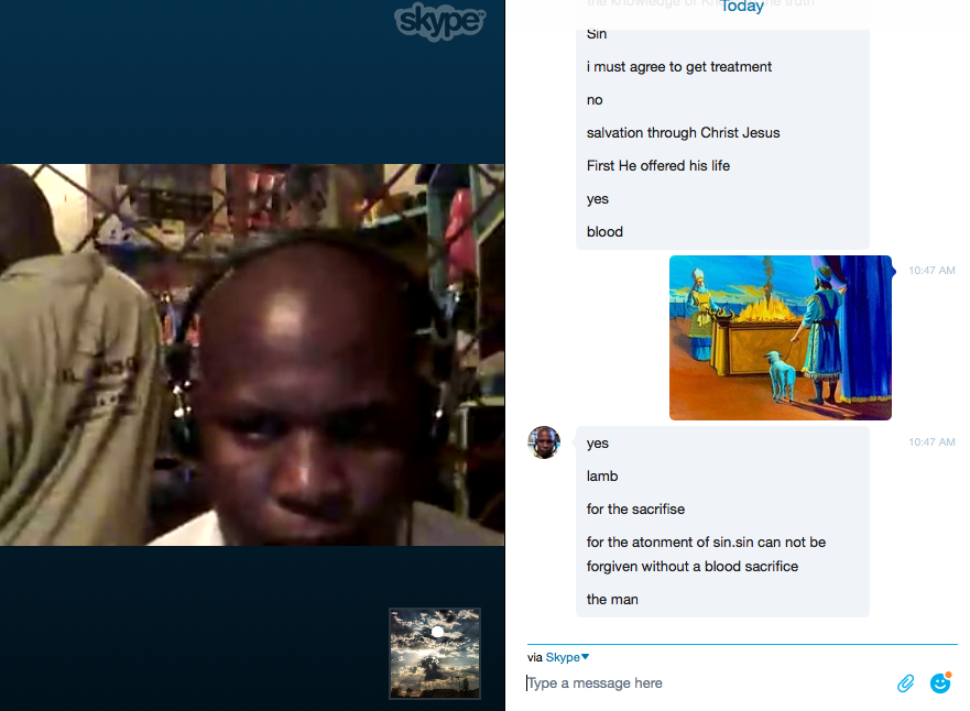 Timothy is hungry for discipleship so we chose not to wait until we could get back to Kenya, or until a training cycle could be begun there. Timothy and I meet once or twice a week for 1.5 hours. We use a wonderful, free technology called Skype.