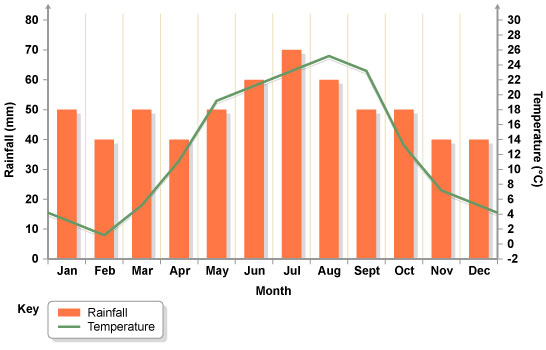 This is a climograph show the amount of rainfall and temperature over a month time span.