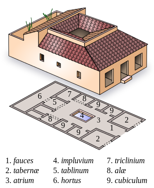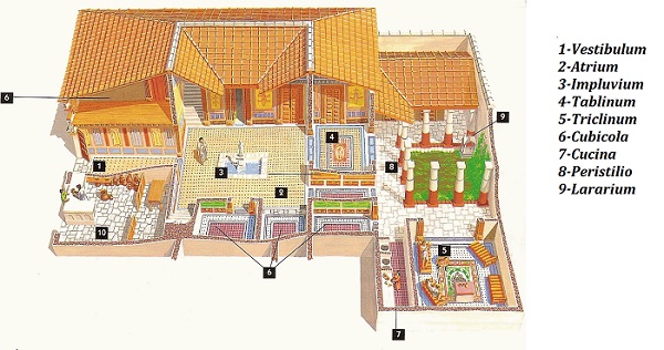 La casa(in latino domus) era l'abitazione destinata ai ricchi patrizi,spaziosa areata e con tutte le comodità desiderabili: latrine, servici igenici, un sistema di riscaldamento per l'inverno(mediante ipocanusti,facendo passare aria calda sotto i pavimenti). Esse erano di pianta rettangolare in mattoni o calcestruzzo, presentavano due aperture l'ostium,che sia affacciava sulla strada,il vestibulum,poi le fauces, un piccolo corridoio che conduceva all'atrium,spazio rettangolare,dove vi era il focolare,usato quando si mangiava di inverno, per riscaldarsi; e l'entrata posteriore il porticum(edificatori in epoca imperiale). La copertura era costituita da falde inclinate verso l'interno, il compluvium, poiché l'acqua piovana (appunto "pluvium") era raccolta nel impluvium,avente una struttura collegata in modo che l'acqua in eccesso finisse per strada e non entrasse nell'abitazione allagando tutto; il soffitto era a cassettoni intarsiati o decorati con stucchi e il pavimento era ornato con mosaici. Attorno all'atrio si trovavano i cubicula("camere da letto) e una parte fondamentale dell'abitazione il tablinum, sala di soggiorno, dedicata al l'accoglienza degli ospiti, quindi fortemente decorata con ritratti rappresentanti gli antenati,oggetti di lusso e altro.