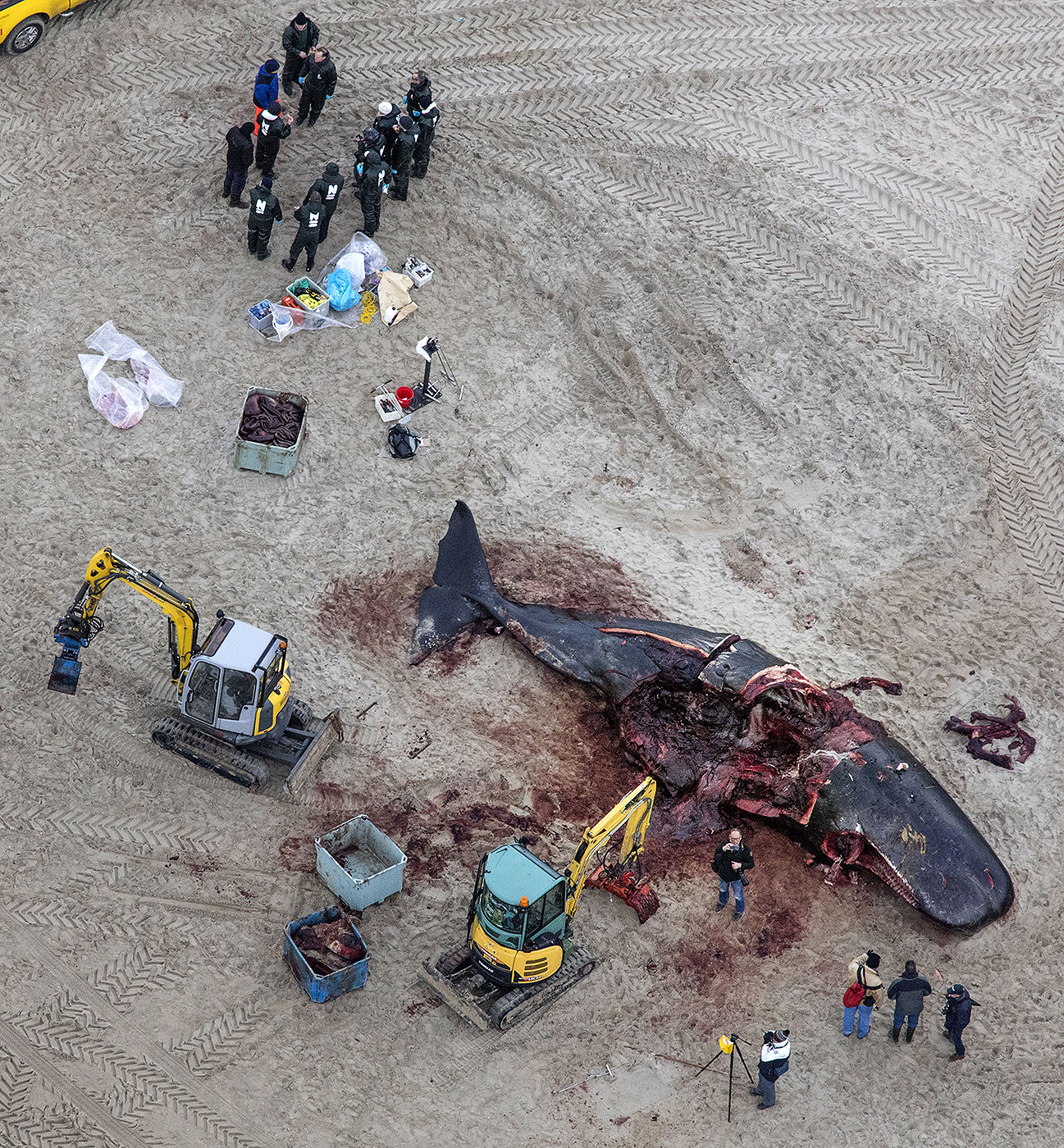 Vista aérea de um cachalote, cetáceo que chega a medir 15 metros de comprimento, na ilha de Texel, na Holanda. Cinco cachalotes, espécie que foi notabilizada como o arquétipo da baleia graças à Mob Dick, encalharam na ilha em 13 de janeiro e morreram. Foto: Stringer/AFP