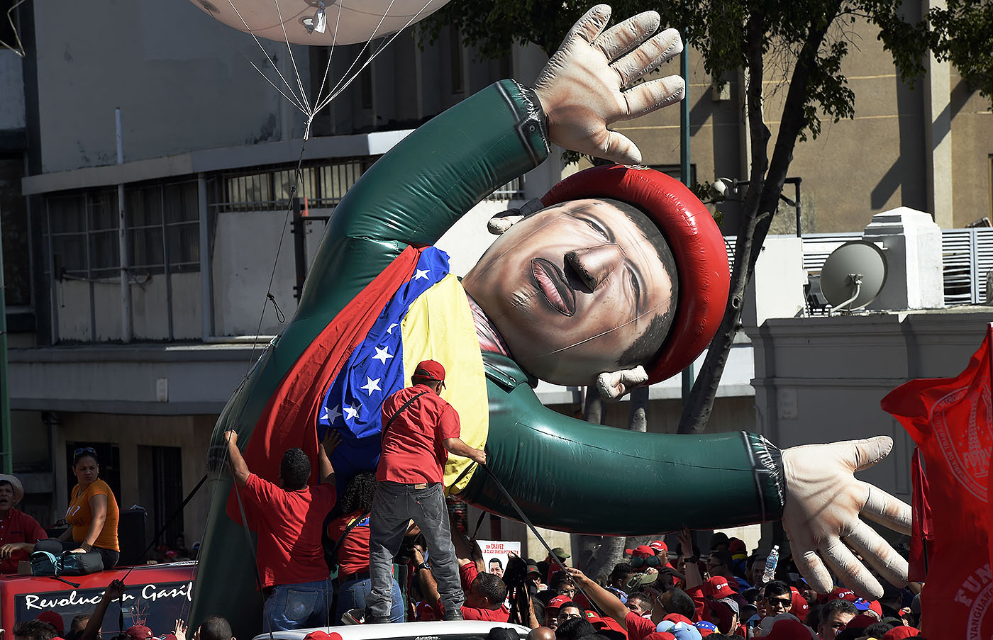Um homem ajuda a levantar um boneco inflável do falecido presidente Hugo Chávez durante uma manifestação dos trabalhadores da estatal de petróleo venezuelana PDVSA, com o apoio do presidente Nicolás Maduro, em frente ao palácio presidencial de Miraflores, em Caracas, no dia 12 de janeiro. A Venezuela mergulhou numa profunda crise política depois que a Suprema Corte considerou nulas as decisões da nova Assembleia Nacional, de maioria oposicionista. Foto: Juan Barreto/ AFP