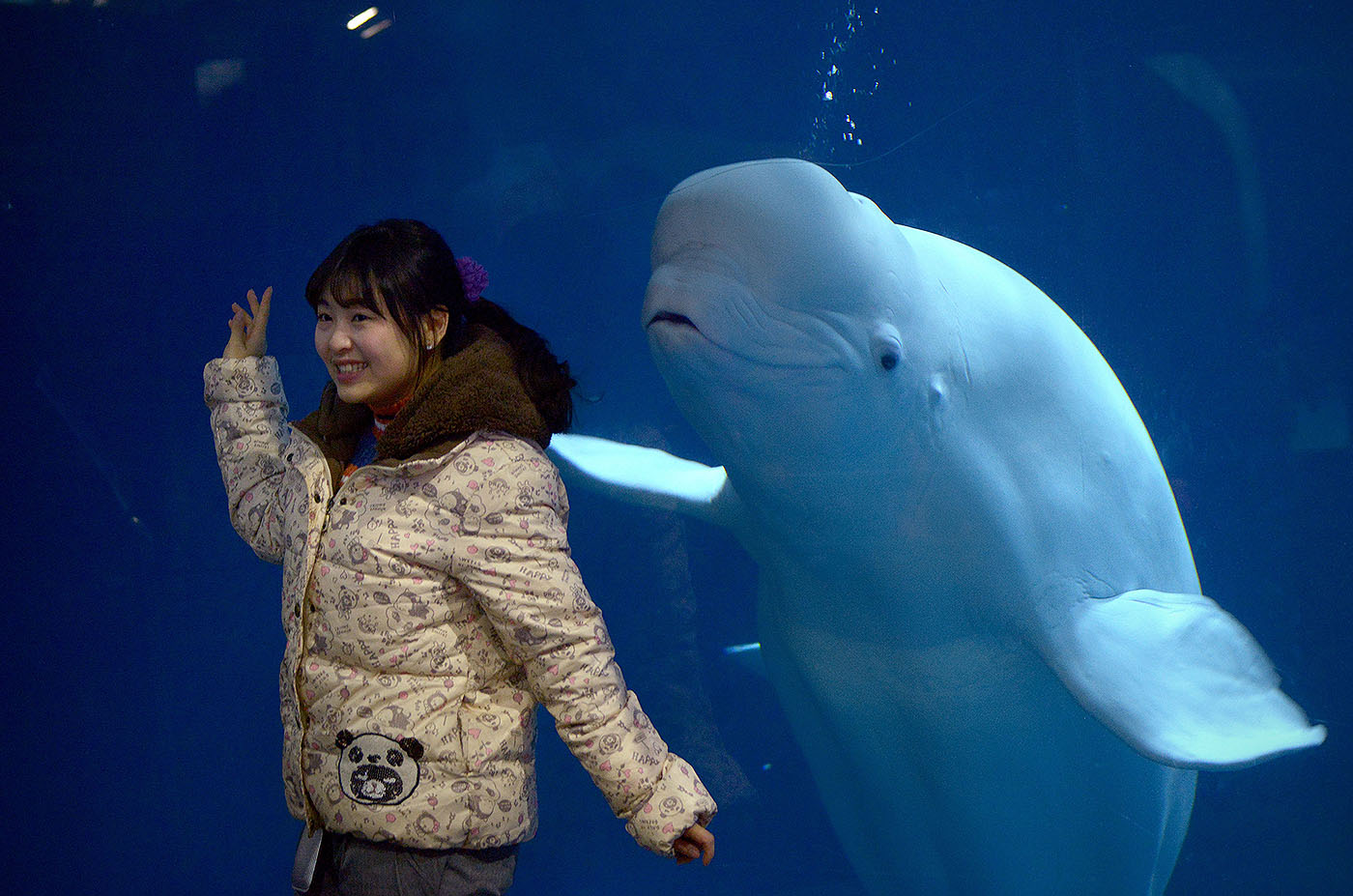 Uma mulher posa para uma foto ao lado de uma baleia beluga no zoológico de Beijing. Foto: Wang Zhao/ AFP