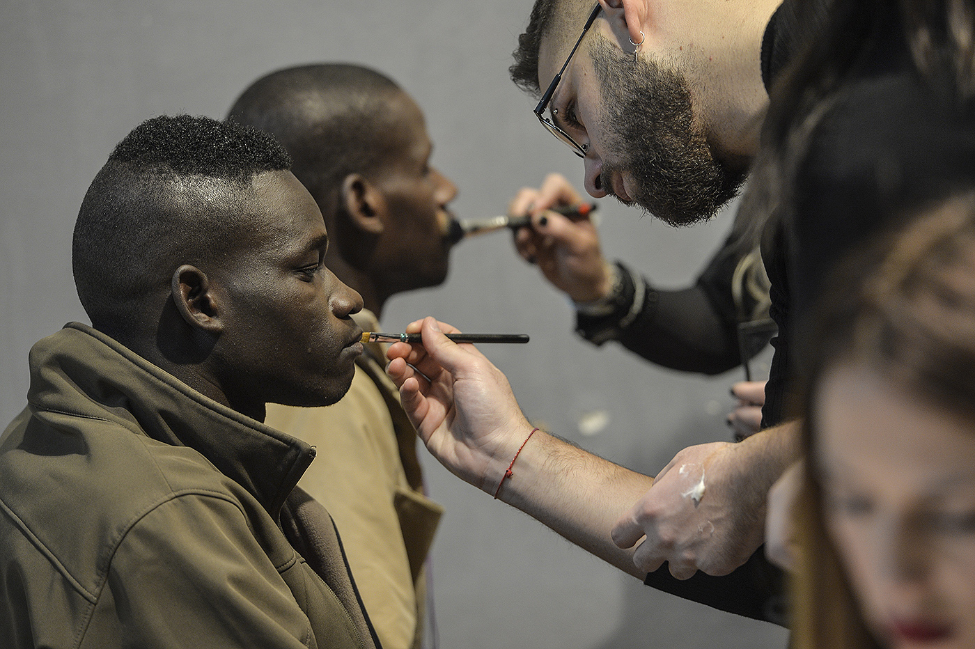 Refugiados do Mali e Gâmbia recebem os último retoques da maquiagem antes de participarem como modelos do evento "Geração África ", durante a Florença Pitti Immagine, prestigiado fórum da moda, na Itália, no último dia 14. Foto: Andreas Solaro/ AFP