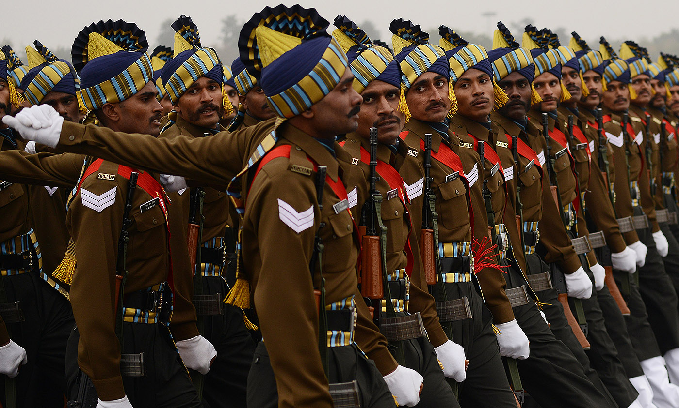 Marcha do Exército indiano durante o desfile do Dia do Exército em Nova Deli, no dia 15. O Exército nacional indiano estava comemorando sua fundação, ocorrida há 67 anos. Foto: Money Sharma/AFP