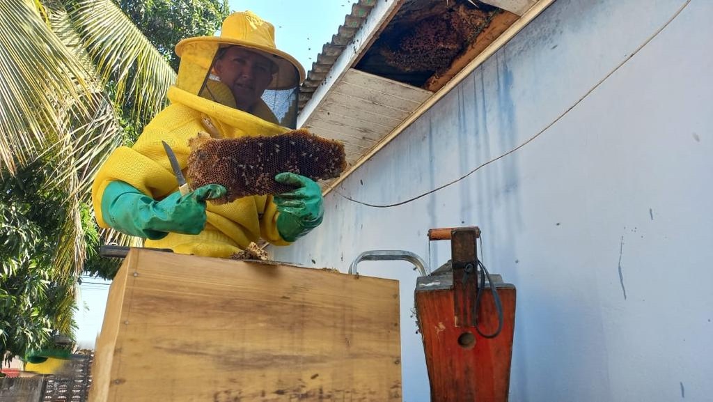Ela recolhe as colmeias com cuidado e as leva para casa, que por coincidência, se chama Sítio Socorro.