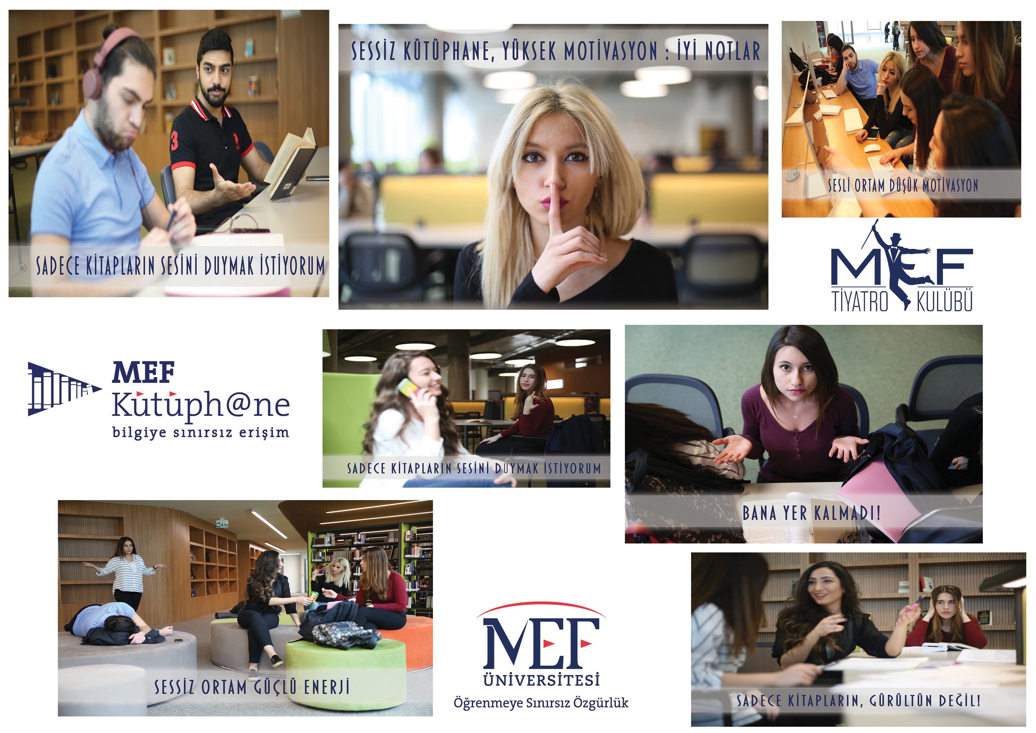 MEF Kütüphane ve MEF Tiyatro Kulübü'nün ortaklaşa olarak yürüttükleri "Kütüphane'de Sessizlik ve Motivasyon" temalı fotoğraf çekimleri sonlanmıştır. Çalışma sonucu çekilen fotoğraflar MEF Kütüphane'de sergilenmekte ve MEF Kütüphane kullanıcılarına mesajlar vermektedir.