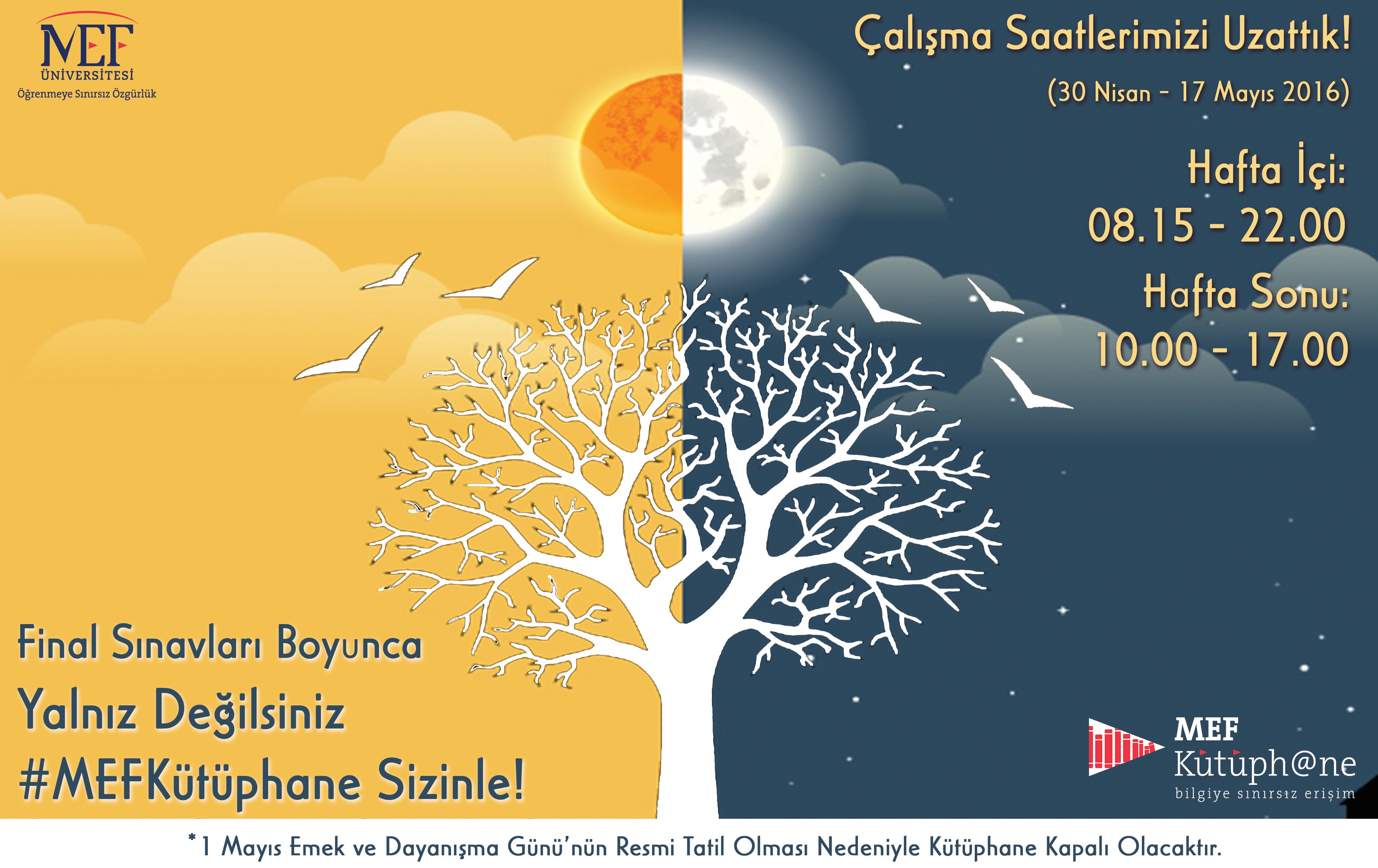 Kütüphane Bülteni’nin yeni sayısını sizlerle paylaşmanın mutluluğunu yaşıyoruz. Yoğun geçen 2015 – 2016 akademik yılının son günlerini yaşıyoruz. Final sınavları son hız devam ediyor ve öğrencilerimiz çok yoğun bir tempoda sınavlara hazırlanıyor ve ter döküyorlar. MEF Kütüphane olarak tüm öğrencilerimize başarılar diliyoruz. Öğrencilerimizin çalışmalarını desteklemek amacıyla final sınavları süresince çalışma saatlerimizi uzattık, bu kapsamda 30 Nisan – 17 Mayıs tarihleri arasında MEF Kütüphane hafta içi 08.15 – 22.00, Cumartesi / Pazar ise 10.00 – 17.00 saatleri arasında açık olacak.