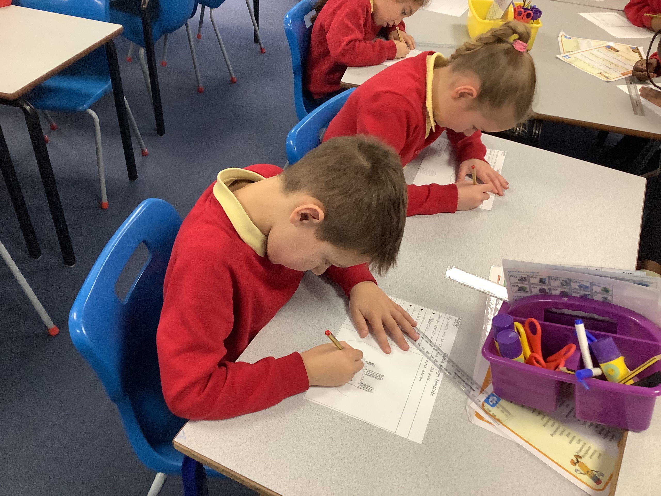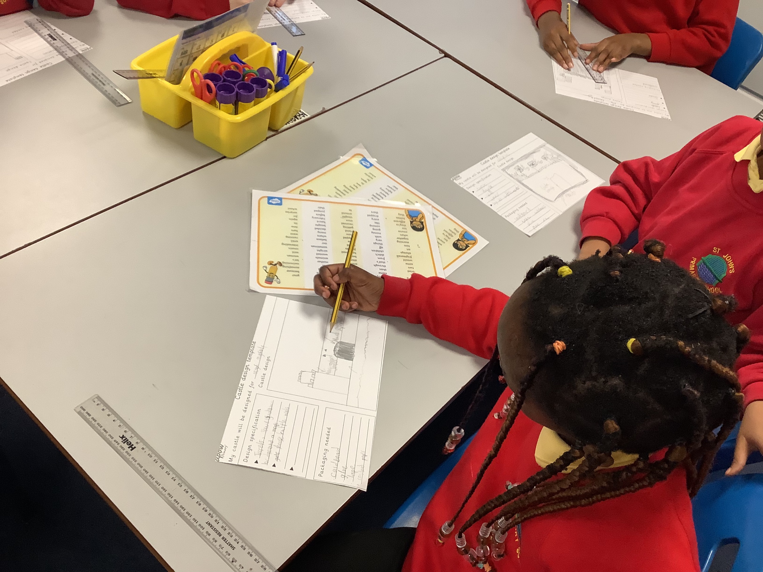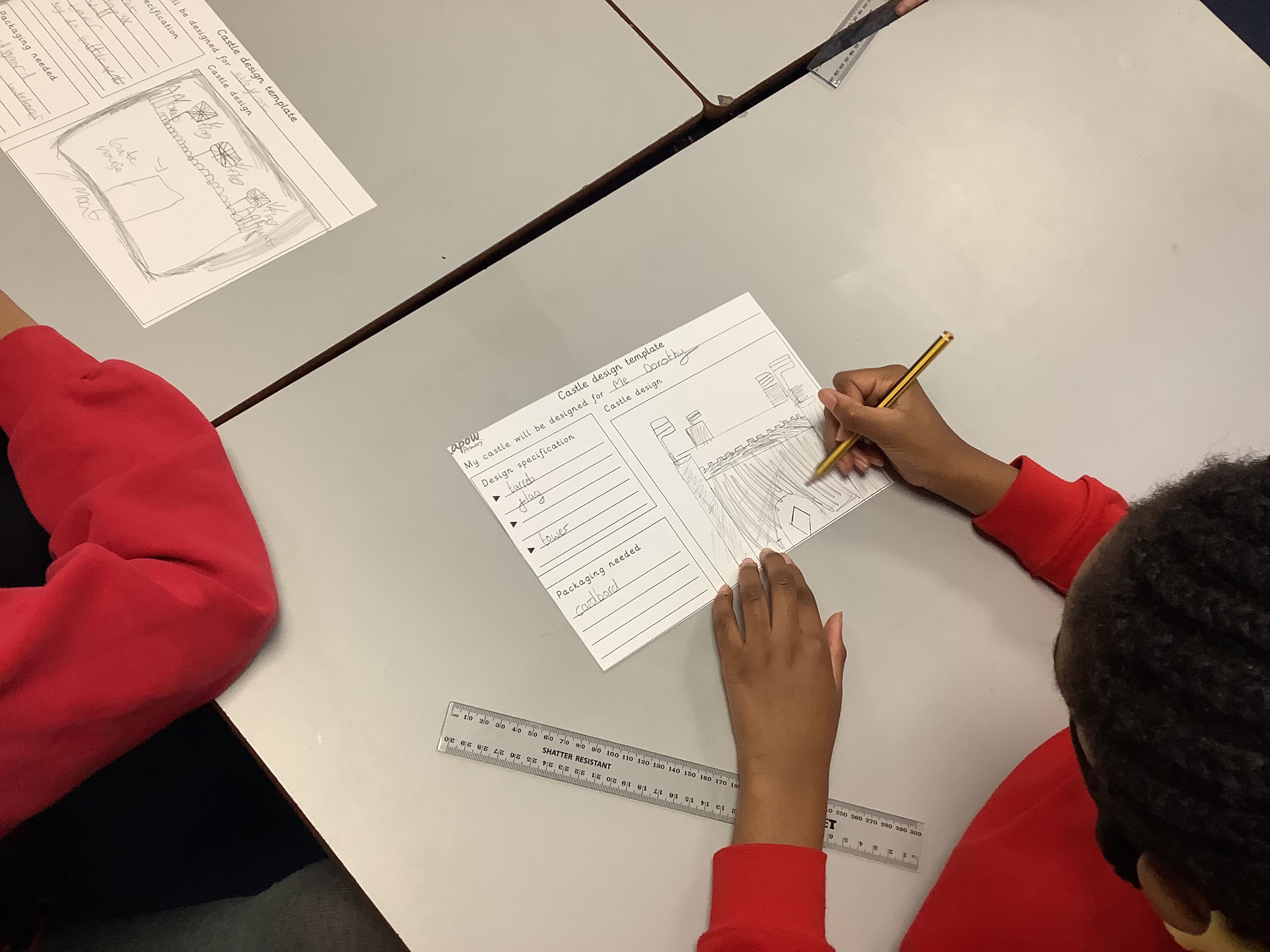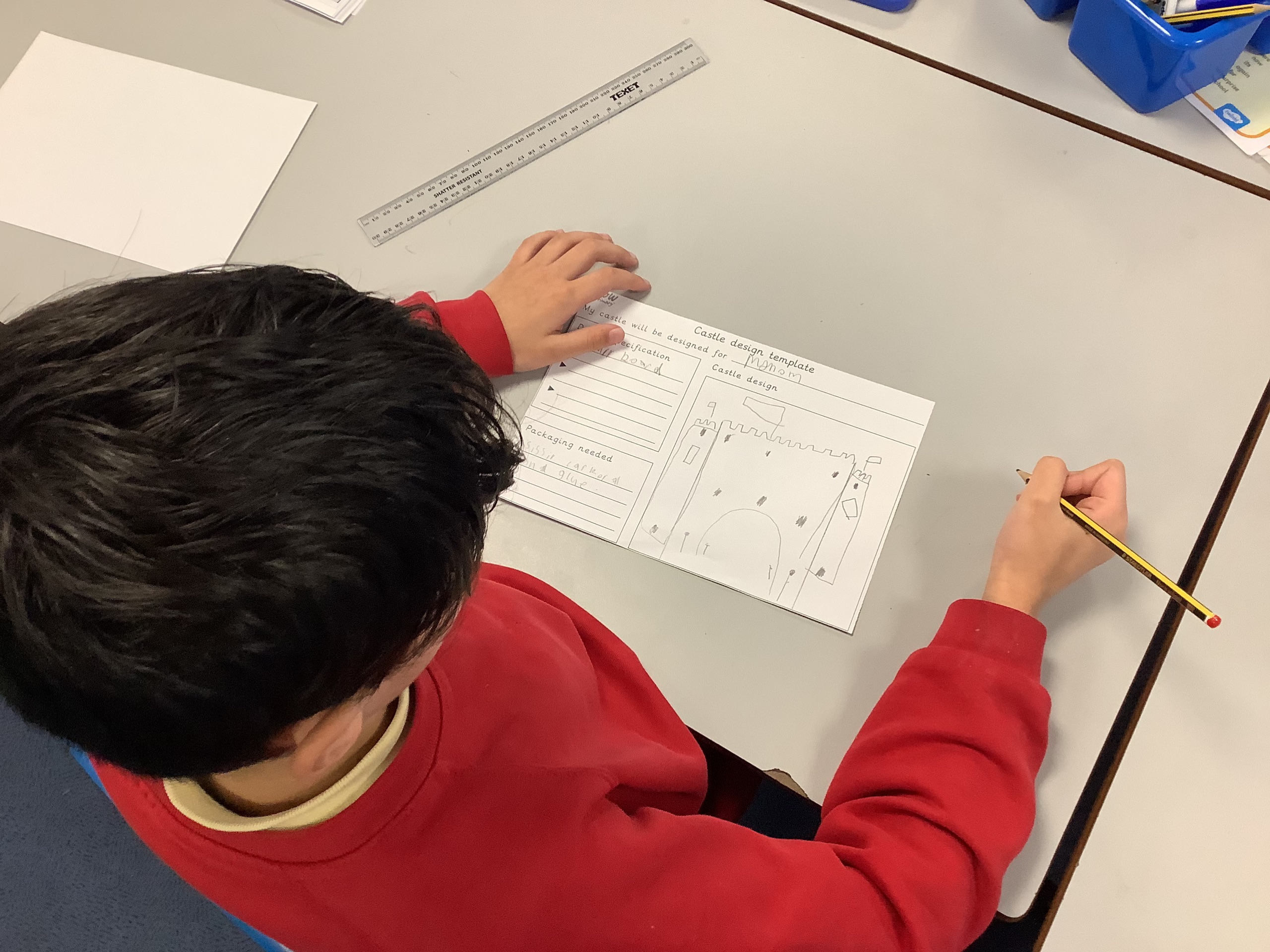 Each member of the class designed their own plan for their castle. They had to think about the different materials they would use to make their design.