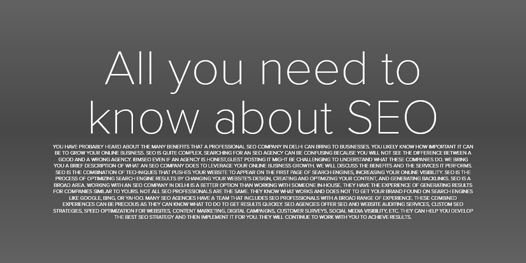 All you need to know about SEOYou have probably heard about the many benefits that a professional SEO Company in Delhi can bring to businesses. You likely know how important it can be to grow your online business. SEO is quite complex. Searching for an SEO agency can be confusing because you will not see the difference between a good and a wrong agency. ibmseo Even if an agency is honest,Guest Posting it might be challenging to understand what these companies do. We bring you a brief description of what an SEO company does to leverage your online business growth. We will discuss the benefits and the services it performs. SEO is the combination of techniques that pushes your website to appear on the first page of search engines, increasing your online visibility. SEO is the process of optimizing search engine results by changing your website's design, creating and optimizing your content, and generating backlinks. SEO is a broad area. Working with an SEO Company in Delhi is a better option than working with someone in-house. They have the experience of generating results for companies similar to yours. Not all SEO professionals are the same. They know what works and does not to get your brand found on search engines like Google, Bing, or Yahoo. Many SEO agencies have a team that includes SEO professionals with a broad range of experience. These combined experiences can be precious as they can know what to do to get results quickly. SEO agencies offer SEO and website auditing services, custom SEO strategies, speed optimization for websites, content marketing, digital campaigns, customer surveys, social media visibility, etc. They can help you develop the best SEO strategy and then implement it for you. They will continue to work with you to achieve results.