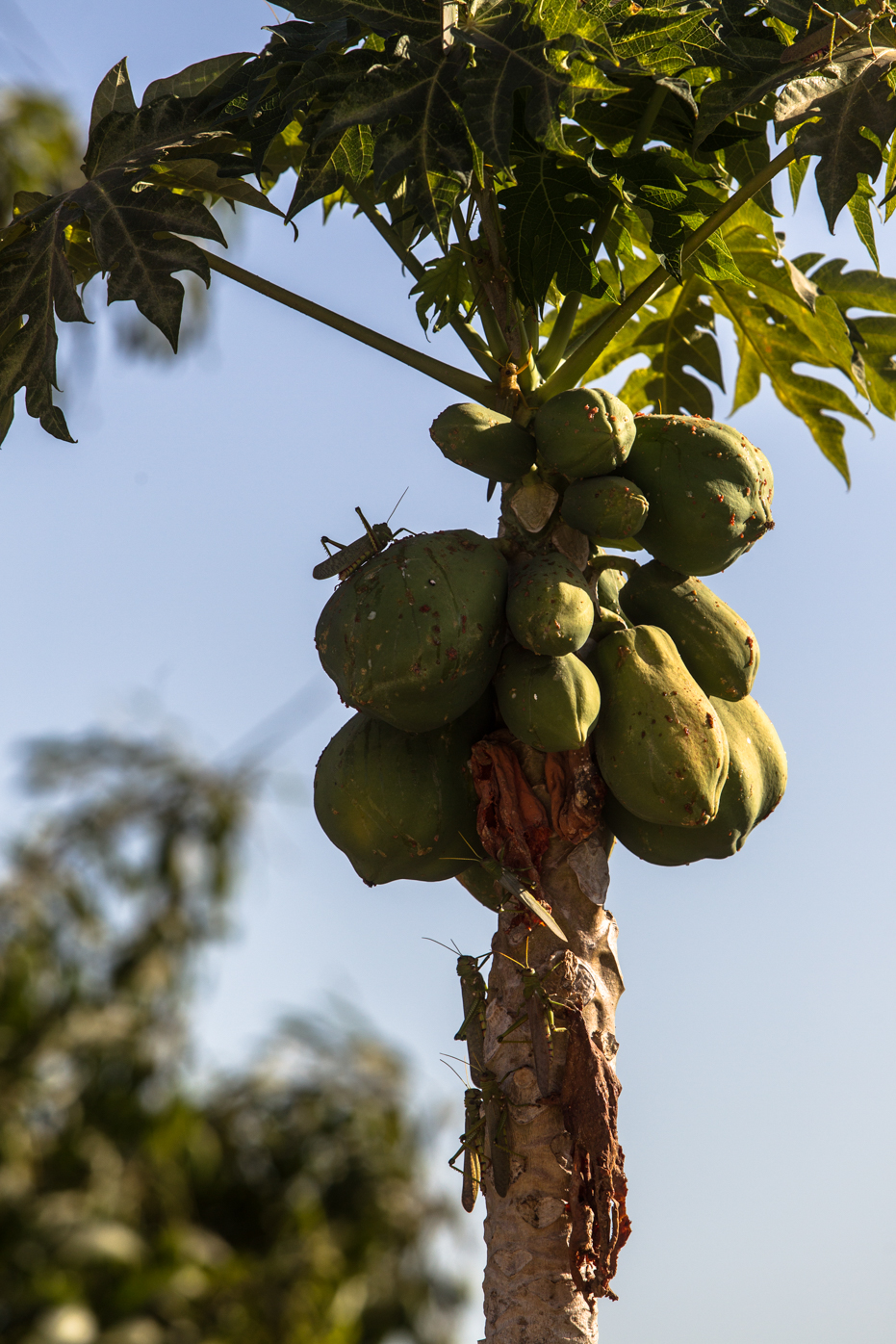 Ao fundo, barco de transporte de areia cruza o rio na cidade de Itacarambi, desviando de ilha para não atolar. Na foto acima, grilos atacam mamoeiro na cidade de Ponto Chique. Moradores dizem que a quantidade deste tipo de inseto aumentou muito nos últimos anos e atribuem o fato ao desequilíbrio climático. Abaixo, fábricas lançam rolos de fumaça à atmosfera na cidade de Pirapora.