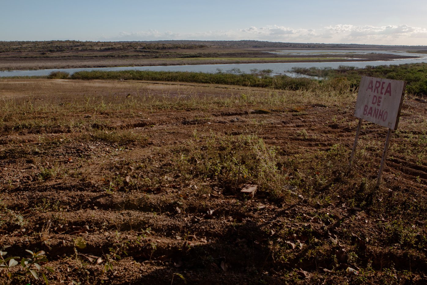 Na cidade de Felixlândia, às margens da Represa de Três Marias, locais antes usados para banho e passeios de lancha mostram os sinais da seca. Pousadas e restaurantes que têm como principal atração a proximidade com a represa registram queda no número de clientes. A foto abaixo mostra placa com os dizeres "área para banho", fincada onde hoje só se vê uma terra avermelhada.