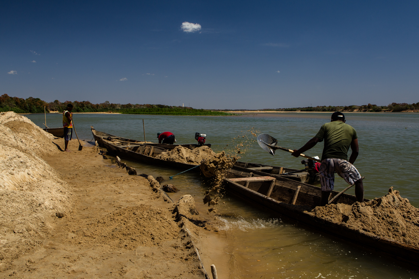 Homens retiram areia do leito do rio, com água na altura dos joelhos. A areia é usada na construção civil, e a retirada, embora condenada por ambientalistas, não é considerada ilegal. Eles têm que ir até o meio do rio, encher o barco de areia e depois jogá-la na margem. Para cada viagem, recebem R$ 6,00. Os mais jovens - e fortes - conseguem fazer, no máximo, sete viagens por dia.