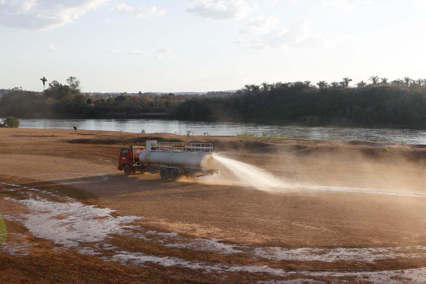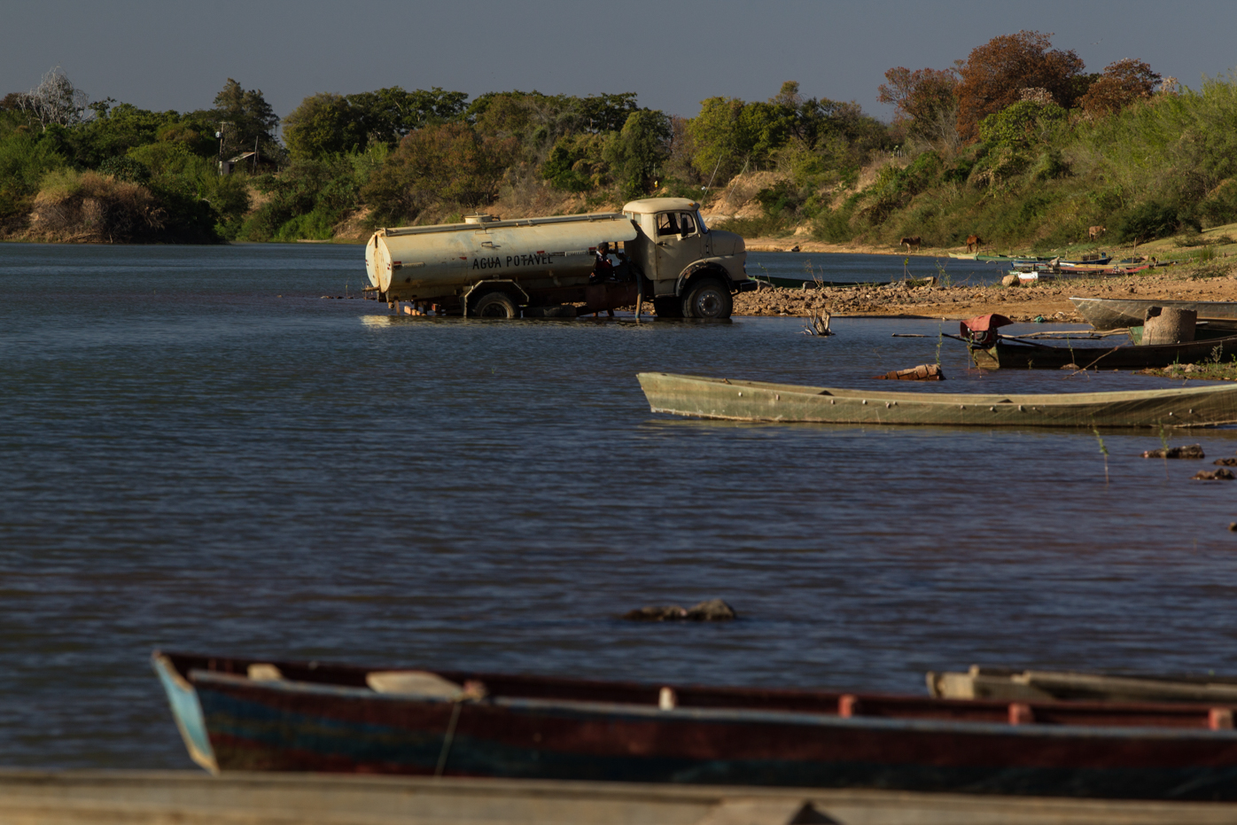 Em Pirapora, o vapor Benjamin Guimarães, que já foi utilizado como meio de transporte, parado às margens do rio porque não há água suficiente para que ele navegue (ao fundo). Acima, caminhão-pipa joga água nos campos de futebol instalados à beira do São Francisco, em área que a água do rio chegava a cobrir.