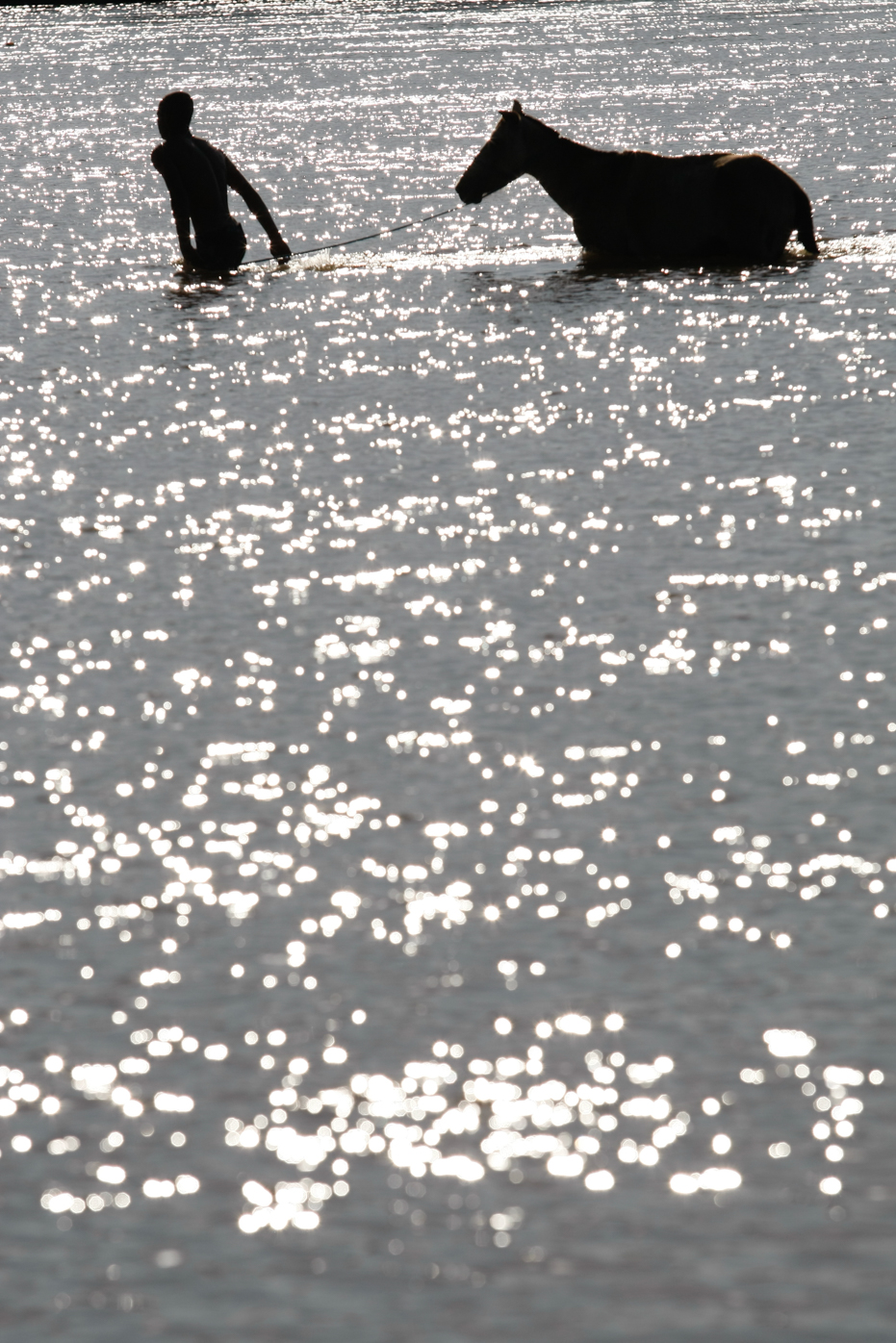 Na cidade de Manga, turistas andam pelo meio do São Francisco. Com a seca, pequenas "praias" se formam no meio do rio. Na foto acima, homem caminha pelo meio do leito do rio com seu cavalo, cena que só é possível devido ao baixo nível da água.