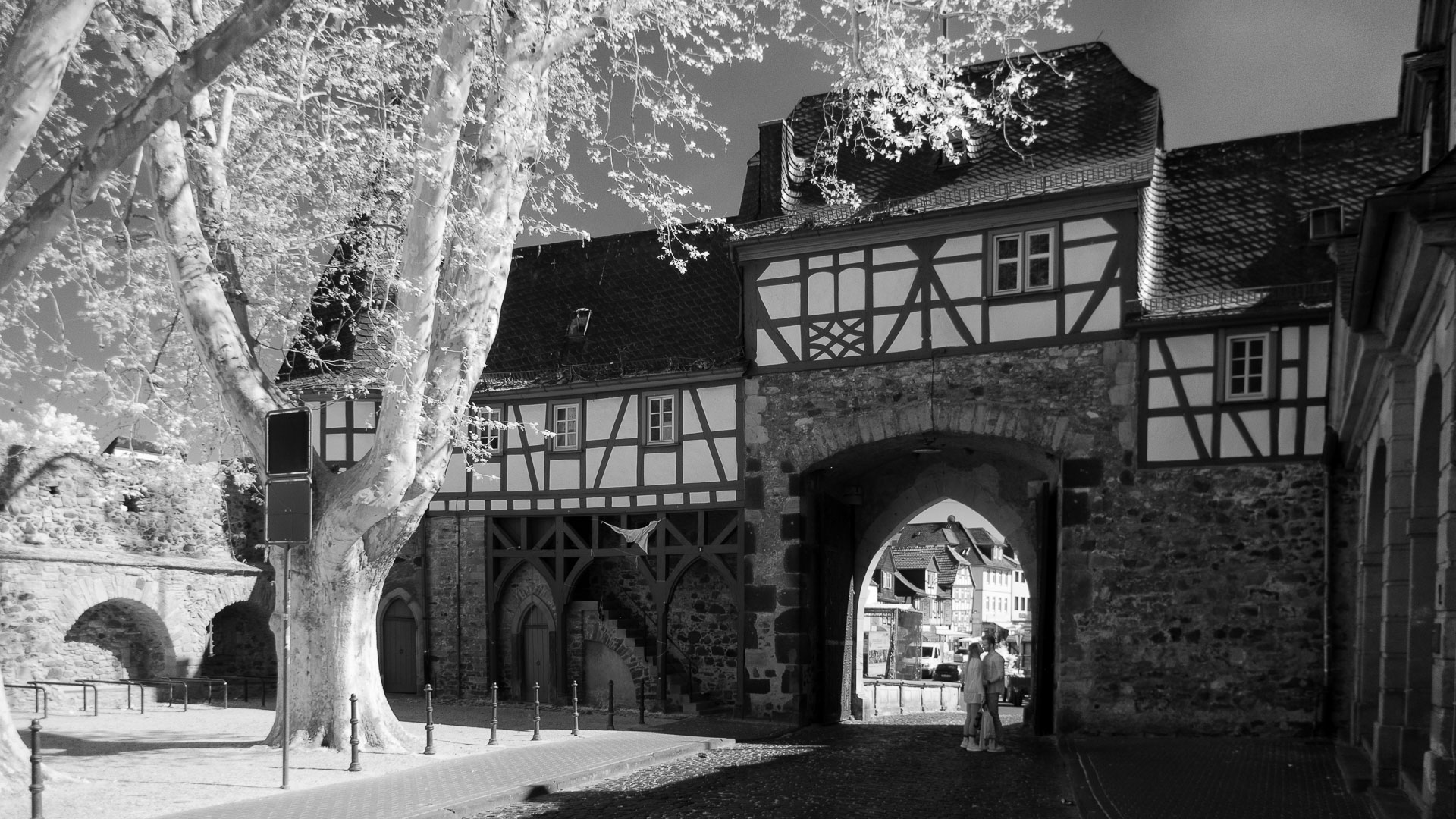 Das südliche, zur Kaiserstraße weisende Tor mit vorgelagertem Graben und ehemaligem Falltor. Über Jahrhunderte waren sich Burg Friedberg und Stadt Friedberg nicht grün.