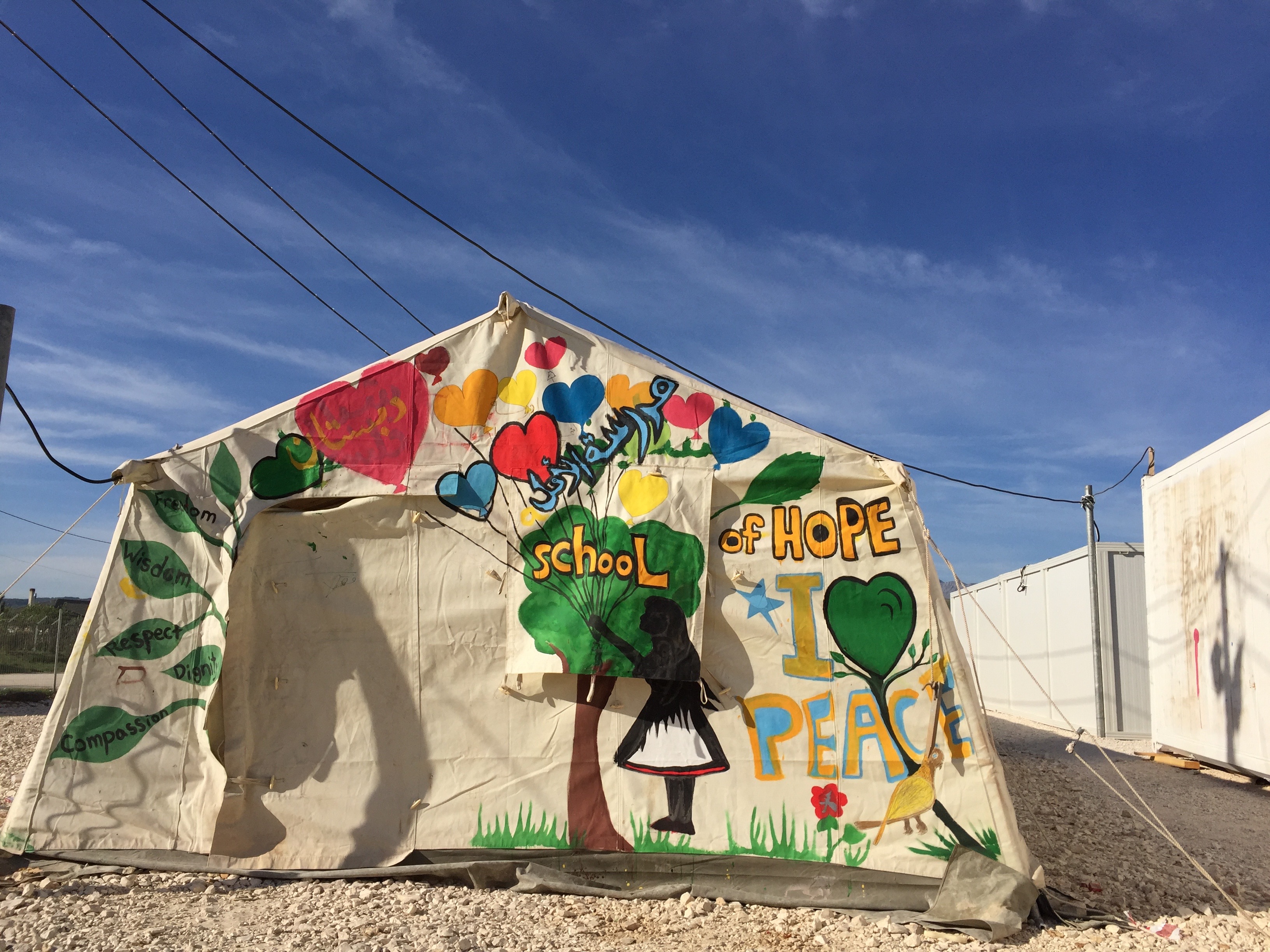 Die Schule, die für die Kinder im Lager entsteht, hat nach einigen Wochen den Namen "School of hope" erhalten. In der ersten Zeit sprachen alle nur von "Workshops" - unverbindlich und kurzfristig. Denn das Eingeständnis, dass dies nun ihre Schule sein wird, die Dixietoiletten ihre Badezimmer, die Zelte für Wochen oder Monate oder Jahre ihre Behausung, dass dieses Leben, das eigentlich kein Leben ist, nun zu ihrem Alltag wird - dieses Eingeständnis muss unendlich schwer fallen. In dem Alltag im Camp ist alles fremdbestimmt. Wo man lebt. Wer neben einem wohnt. Wann es Essen vom Militär gibt. Was es zu essen gibt.