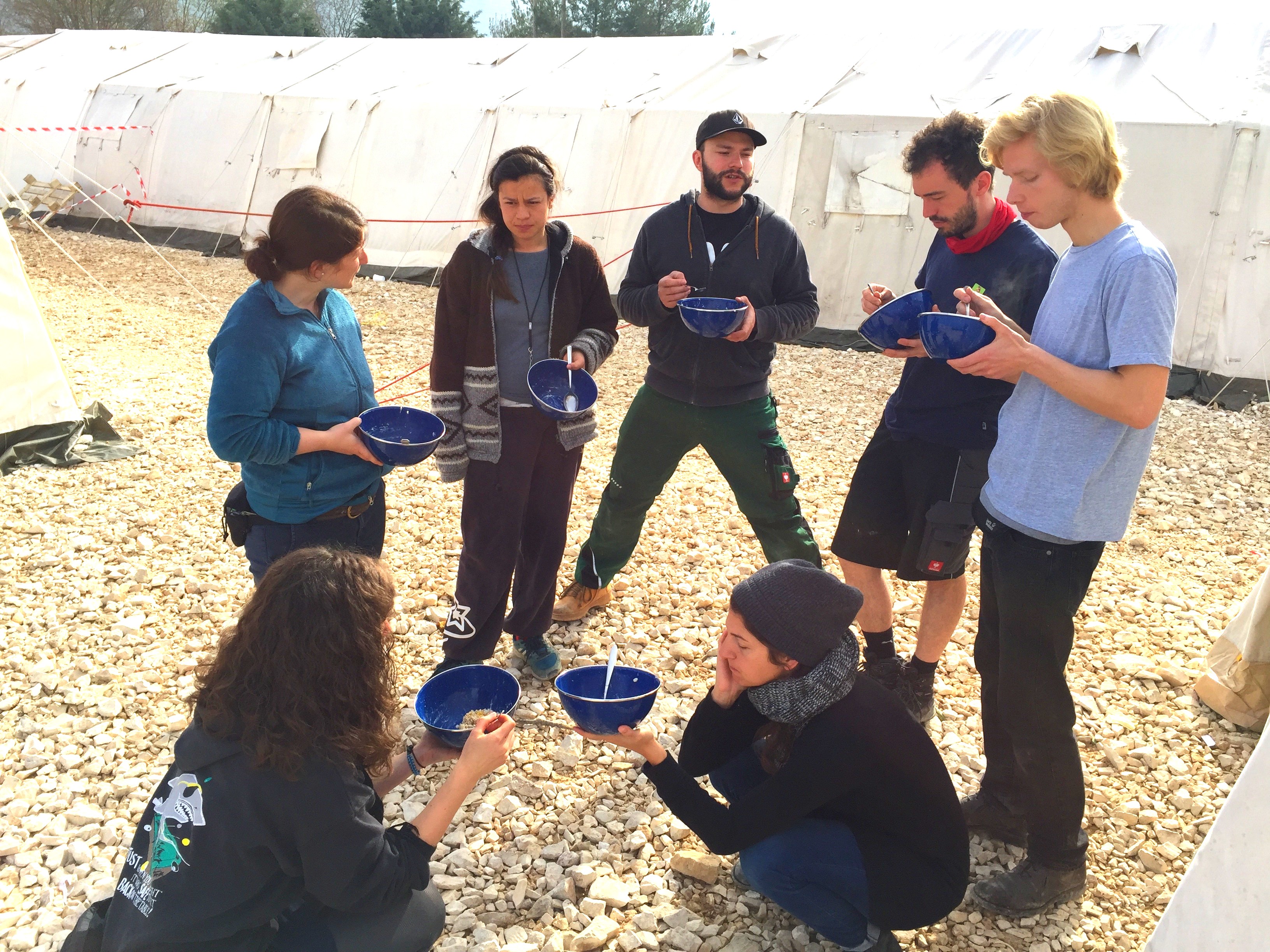 Die Zelte, in denen Familien mit bis zu 10 Personen untergebracht sind, wurden unmittelbar auf grobem Kies errichtet, auf dem die Menschen zunächst auch schlafen. Nach und nach gelingt es, Isomatten und Matratzen zu organisieren.