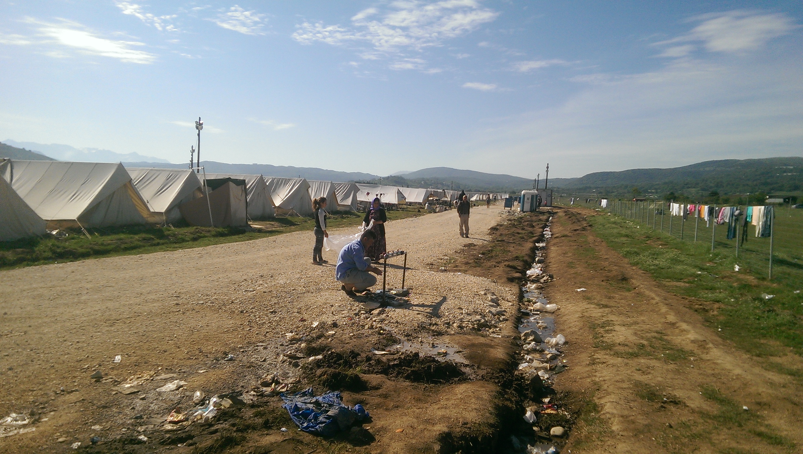 Es gibt kein warmes Wasser, was für die Körperhygiene und den Abwasch problematisch ist. Die wenigen Wasserhähne, die am Rande des Camps provisorisch eingerichtet wurden, haben keinen Abfluss. Abwasser mischt sich so mit Essensresten, was nicht nur ein Herd für Krankheitserreger ist, sondern auch Ratten und damit Schlangen anzieht.