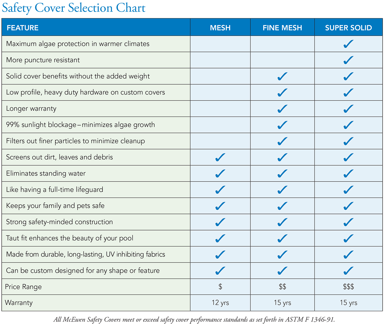 All McEwen Safety Covers are impressively strong. According to the American Society for Testing and Materials, a safety cover must be able to hold a weight of 485 lbs, cover any gaps that a child or pet could squeeze through, and remove standing water. All McEwen Safety Covers meet or exceed the Performance Standards for Safety Covers as outlined in ASTM Designation F 1346-91. The sturdy brass and stainless steel anchoring system keeps the cover secure and the tamper-proof design of our product ensures that when the cover is on, it stays on.