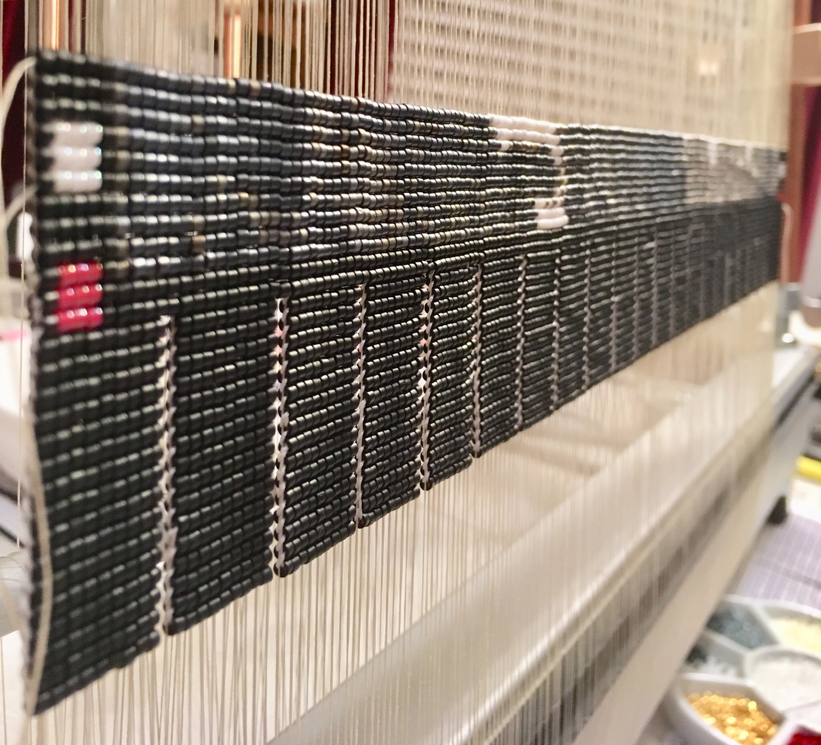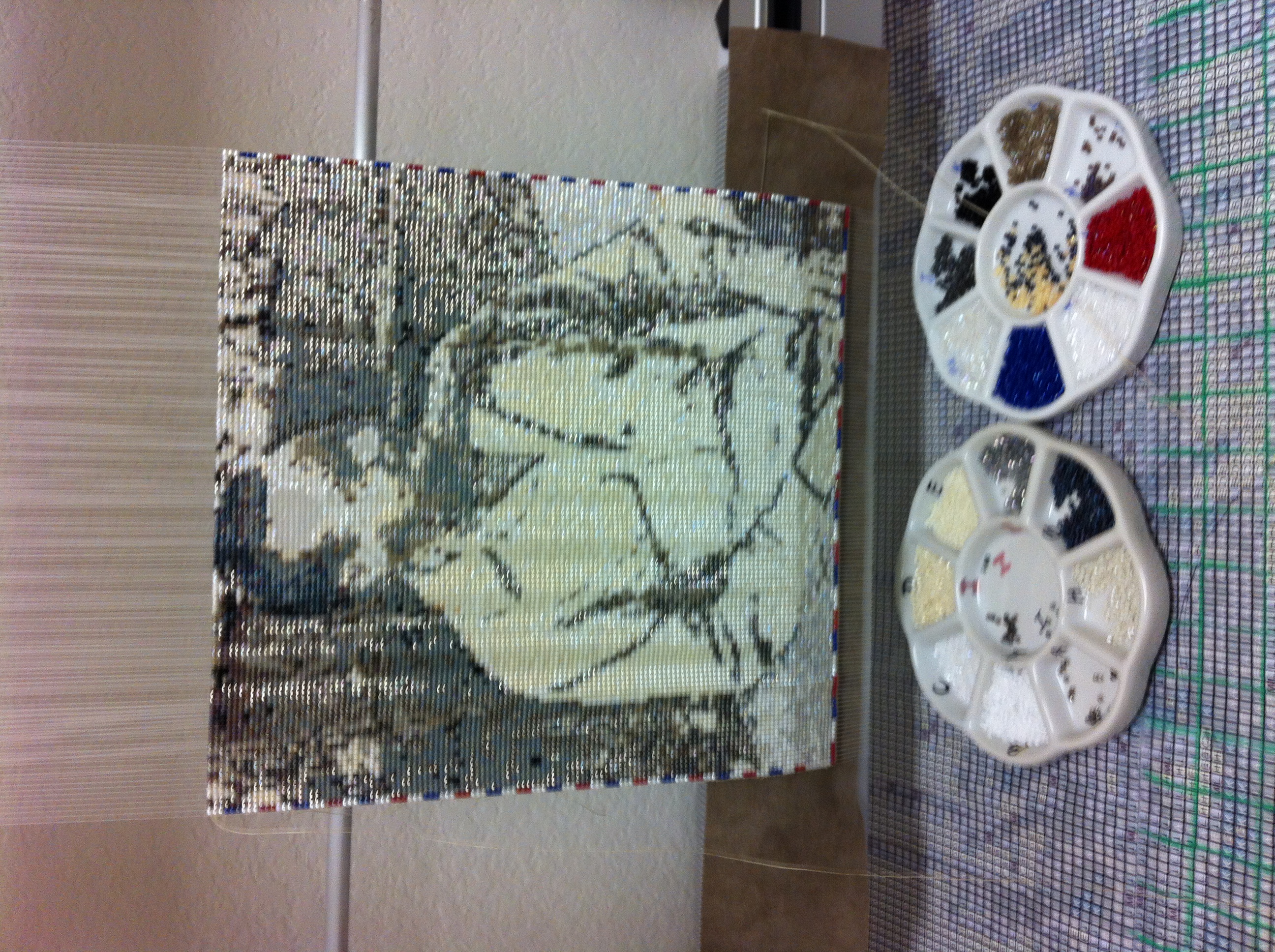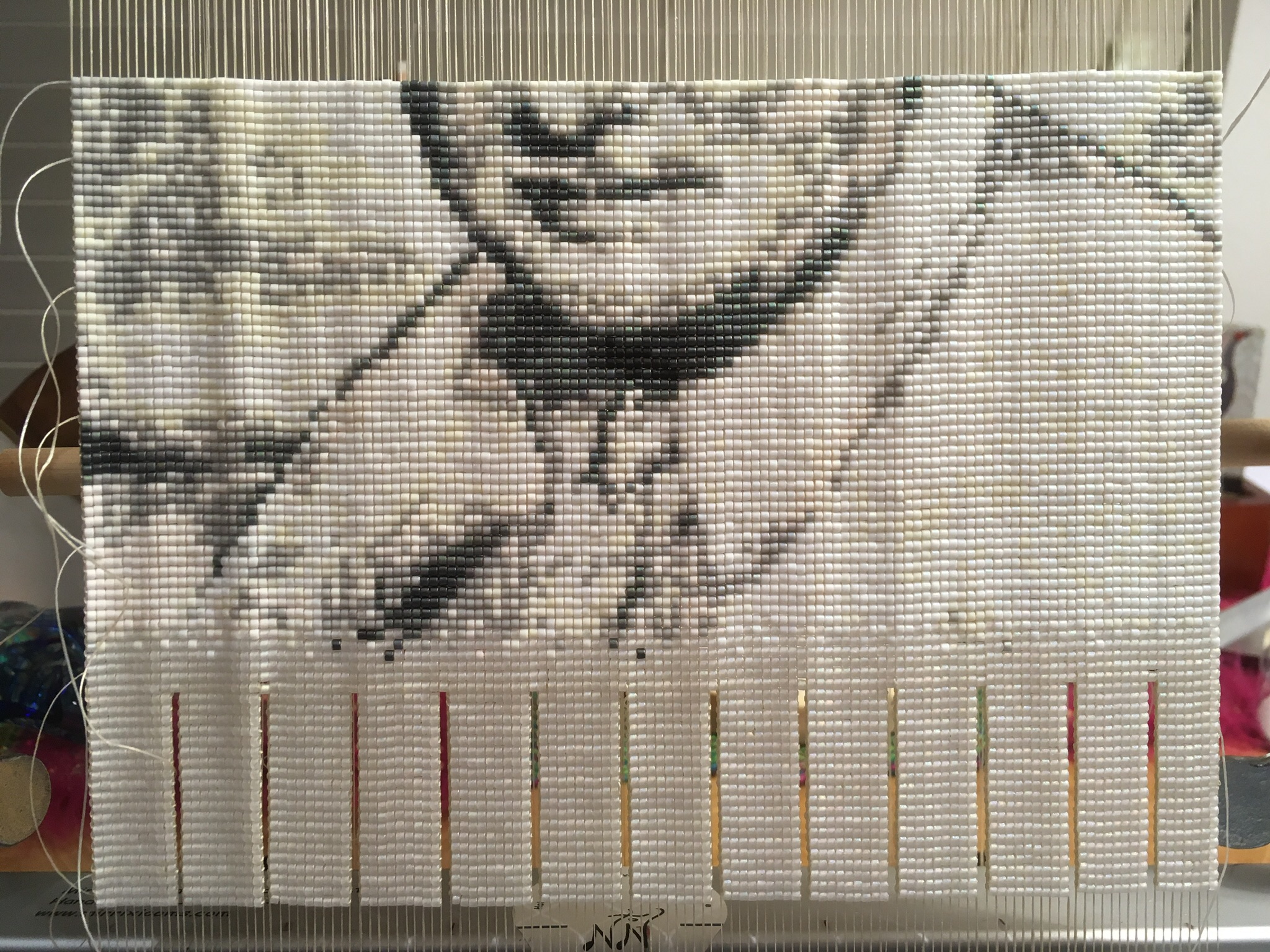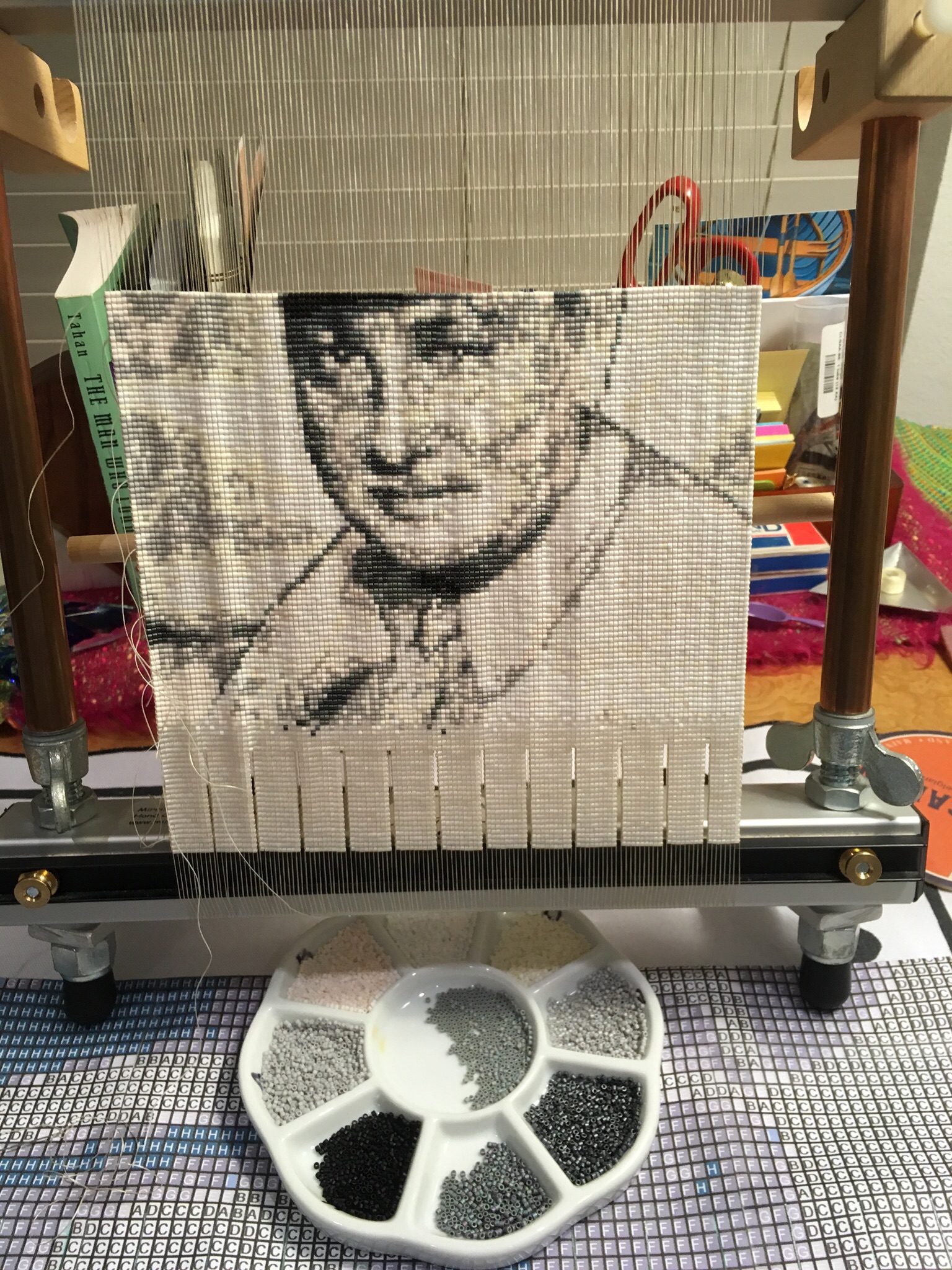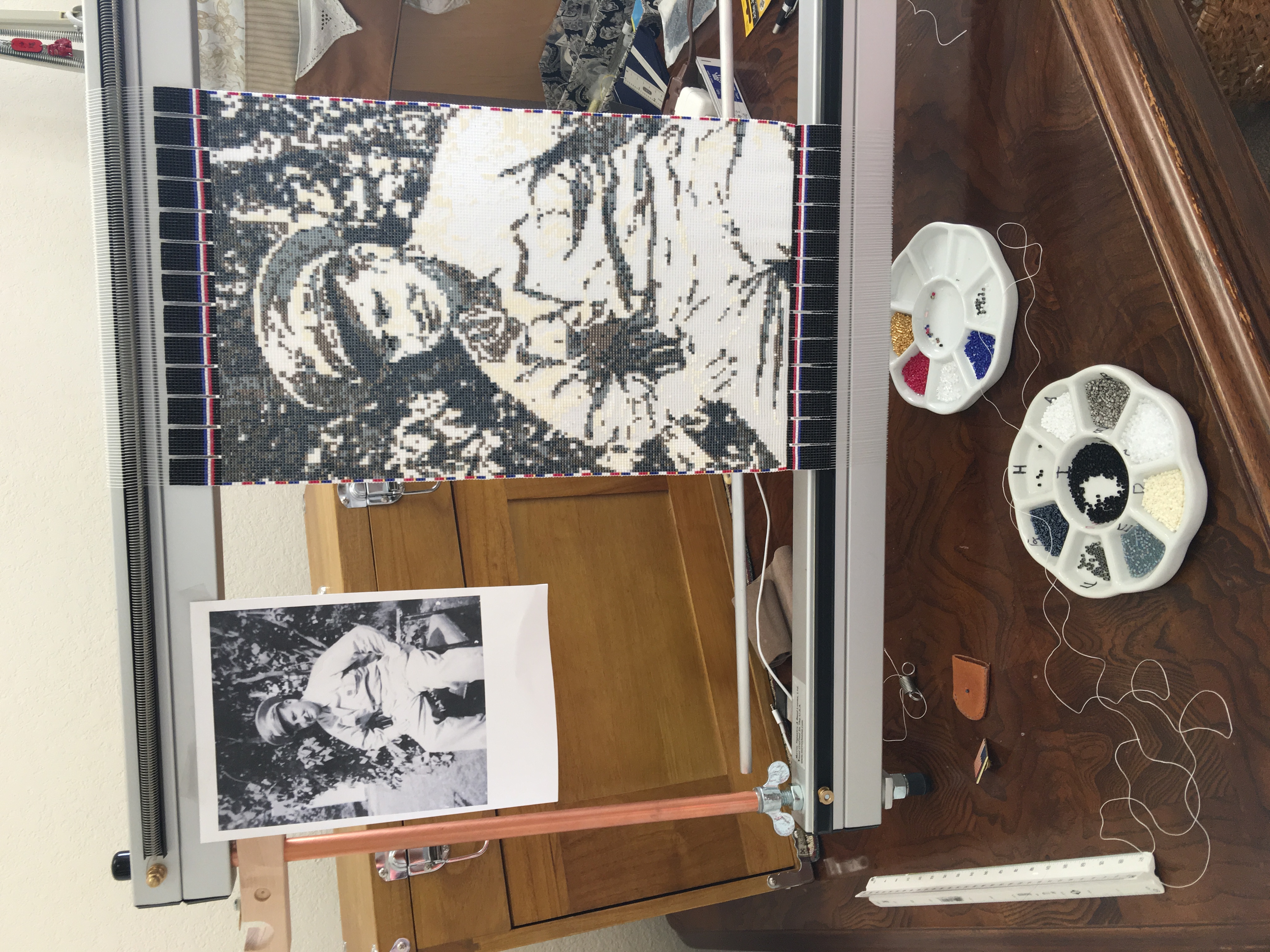 I actually created four tapestries of my Grampa Kenney. The first two, pictured below, were made using size 10 precision cut delica beads (slightly larger than the size 11 I normally use for my tapestries). FYI, unlike most measurement systems, bead sizes get smaller as the number increases! As a result, these first two tapestries turned out too pixelated, so I dismantled them, resulting in a “bead pool” of about 50,000 assorted colored beads. After weeks and weeks of sorting out the colors, I created the Chet and Dolly tapestry above from these beads, and once again, the image was still a little too pixelated for my liking. I am happy to say that my Aunt Rosalie now possesses this version. The final tapestry in this Kenney series, Grampa in his hat and uniform using size 11 beads came out as I wished.