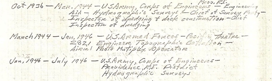 - October 1936 - March 1944 - US Army, Corps of Engineers, Providence R.I. - Engineering Aid - Hydrographic Surveys - Chief of Survey Party - Inspector of dredging and dock construction - Chief Inspector of dredging