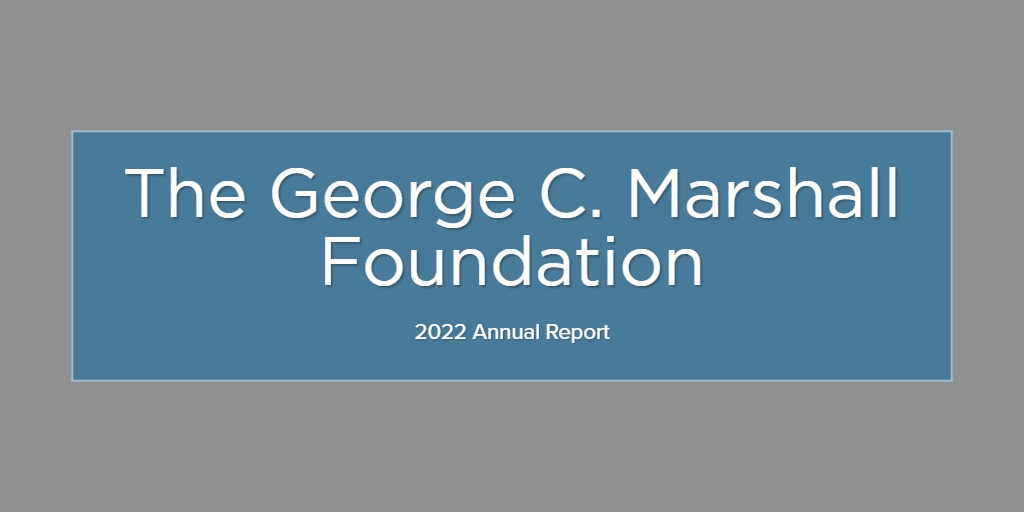Throughout this report you see an ascending George C. Marshall Foundation. Emerging from the pandemic, we embarked on our strategy of demonstrating the continued relevance of one of the twentieth century’s most important figures. We welcomed people back to conduct research and be enlightened by first-rate speakers. Not relying solely on traditional programs, we offered events across Virginia and in the new world of livestreaming. Similarly, even as we hosted scholars in our beautiful building, we made significant strides to make our research collections available to a global audience through our new website. In everything we did in 2022—from our publications to our awards gala honoring Condoleezza Rice and Ken Griffin—we used the 75th anniversary of the Marshall Plan to bring attention to the achievements and example of George Catlett Marshall. In a year that saw a land war break out in Europe, the legacy of the architect of victory in the last such conflict and of the peace that followed for 77 years is more relevant than ever.