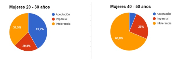 Los porcentajes encontrados en los resultados de las encuestas de actitud logran reflejar que las dos unidades de estudio tienen posturas diferentes. Las mujeres de 40 a 50 años se muestran inclinadas a la intolerancia a la temática homosexual y el contenido de sexualidad que al contrario es aceptado por las mujeres de 20 a 30.