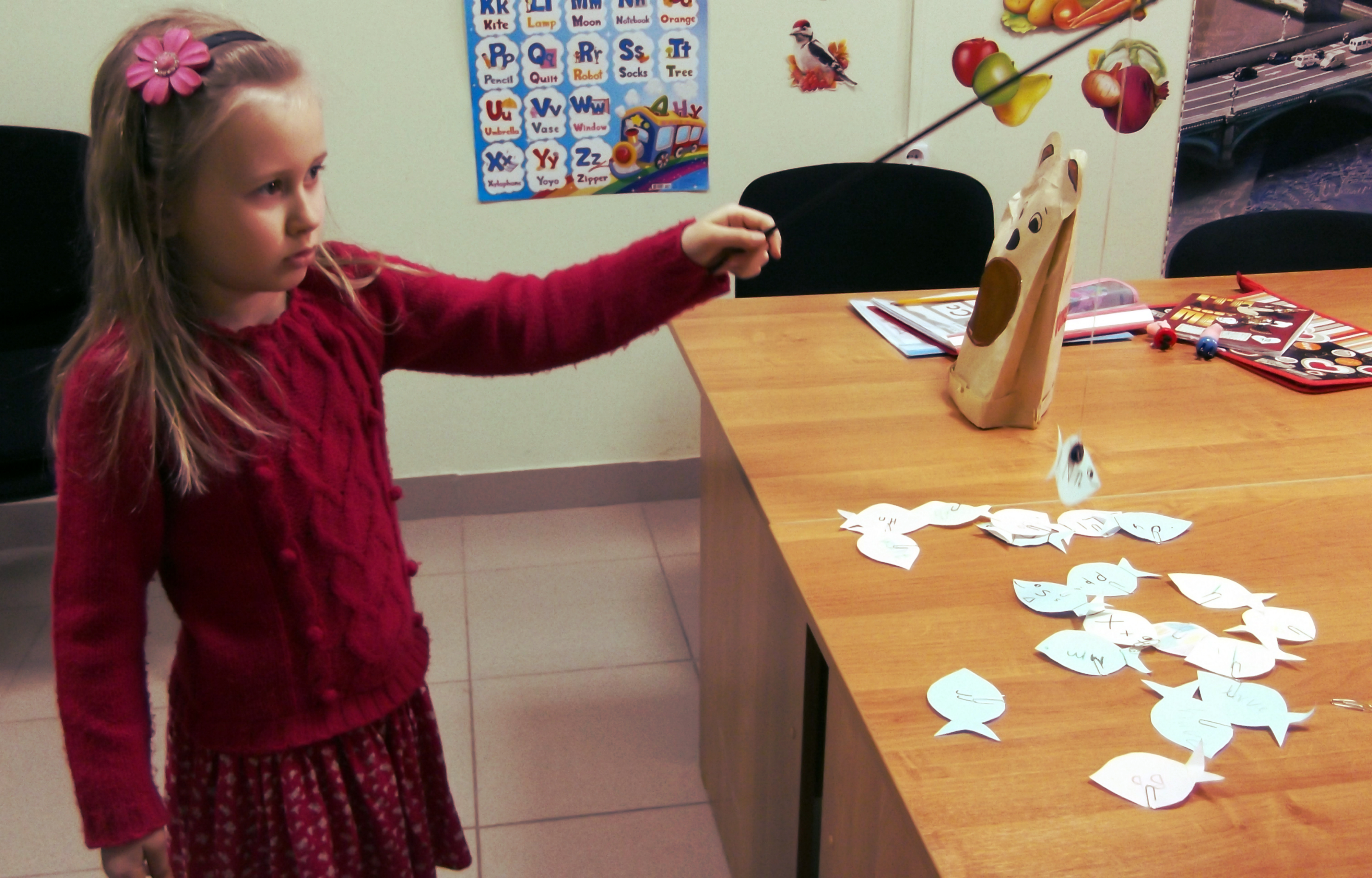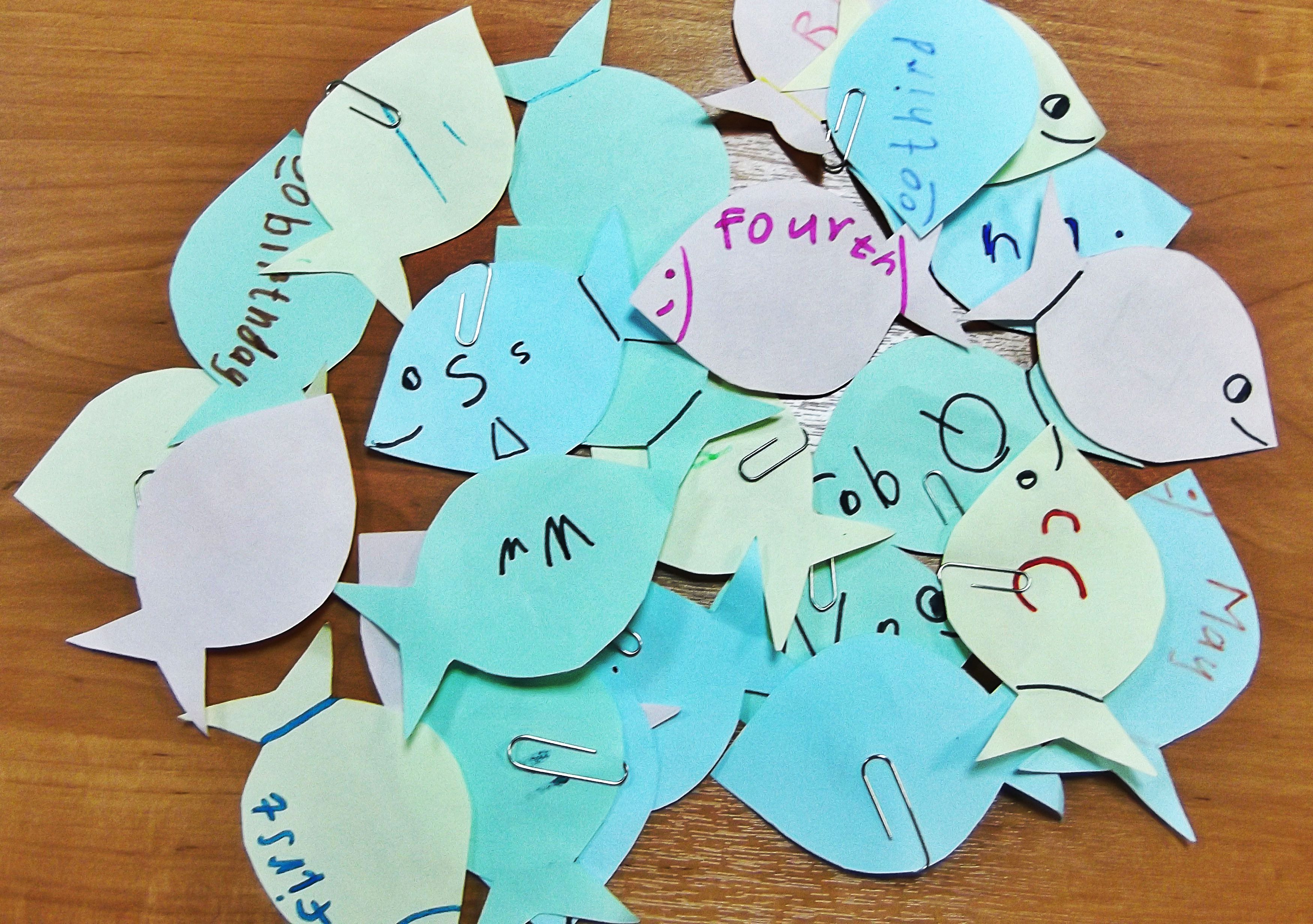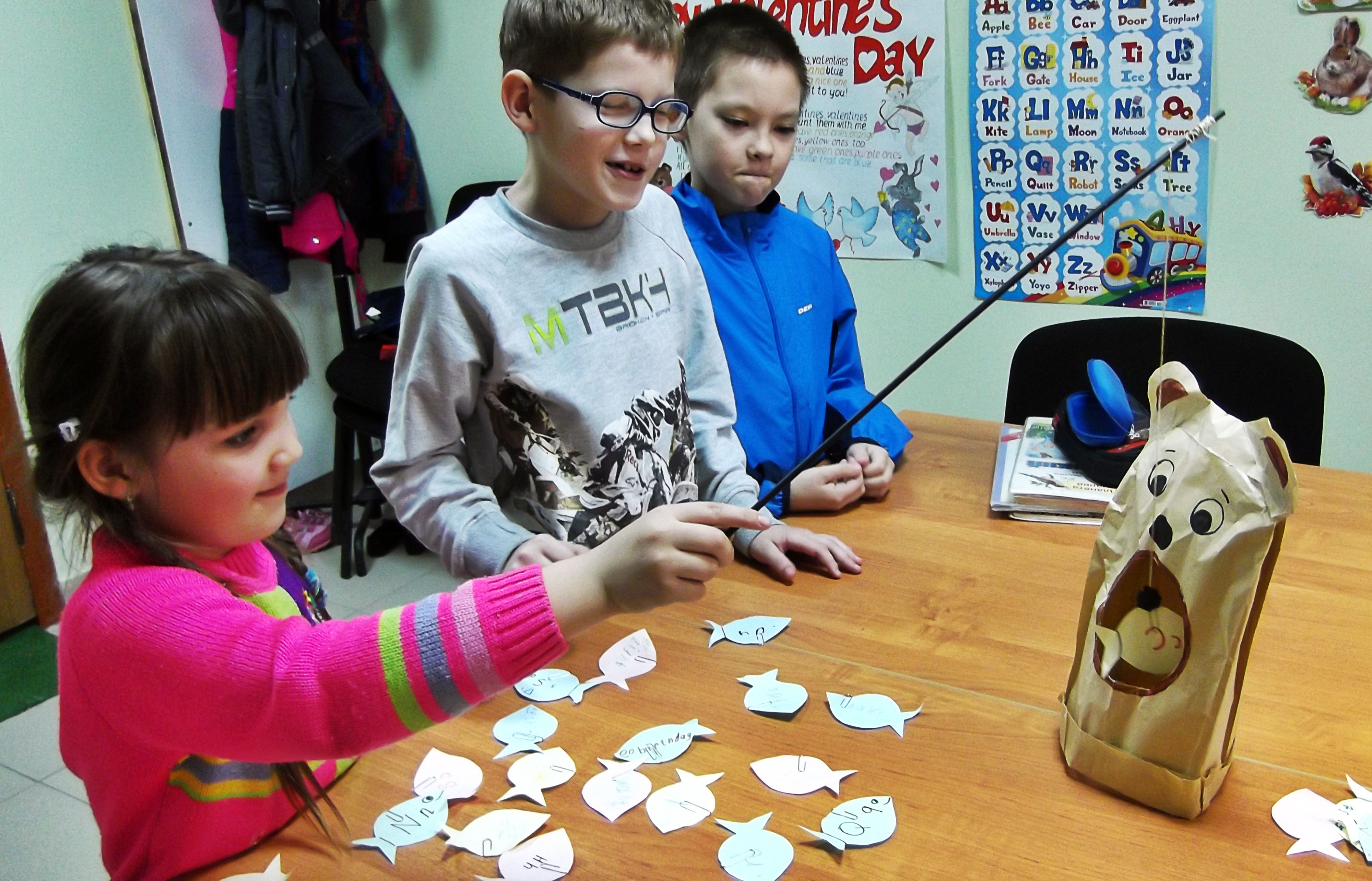 А еще можно отправиться на рыбалку за буквами или словами и накормить ими голодного медведя. Удочку можно сделать привязав на палочку магнит. Буквы или слова написать на бумажных рыбках, на которые надеты скрепки. Медведя можно сделать из обычного бумажного пакета.