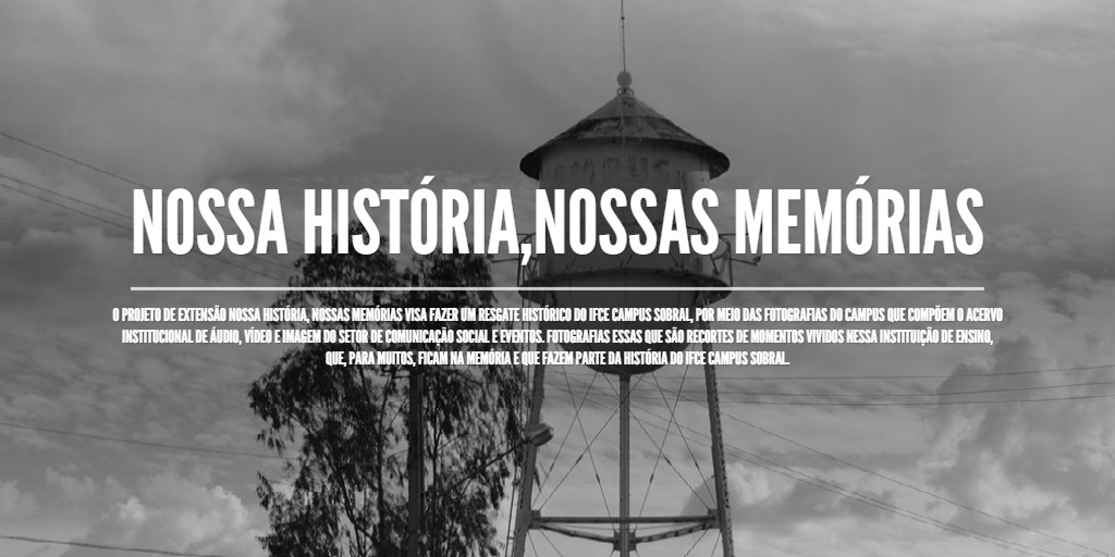 Nossa História,NOSSAS MEMÓRIAS O PROJETO DE EXTENSÃO NOSSA HISTÓRIA, NOSSAS MEMÓRIAS VISA FAZER UM RESGATE HISTÓRICO DO IFCE CAMPUS SOBRAL, POR MEIO DAS FOTOGRAFIAS DO CAMPUS QUE COMPÕEM O ACERVO INSTITUCIONAL DE ÁUDIO, VÍDEO E IMAGEM DO SETOR DE COMUNICAÇÃO SOCIAL E EVENTOS. FOTOGRAFIAS ESSAS QUE SÃO RECORTES DE MOMENTOS VIVIDOS NESSA INSTITUIÇÃO DE ENSINO, QUE, PARA MUITOS, FICAM NA MEMÓRIA E QUE FAZEM PARTE DA HISTÓRIA DO IFCE CAMPUS SOBRAL.
