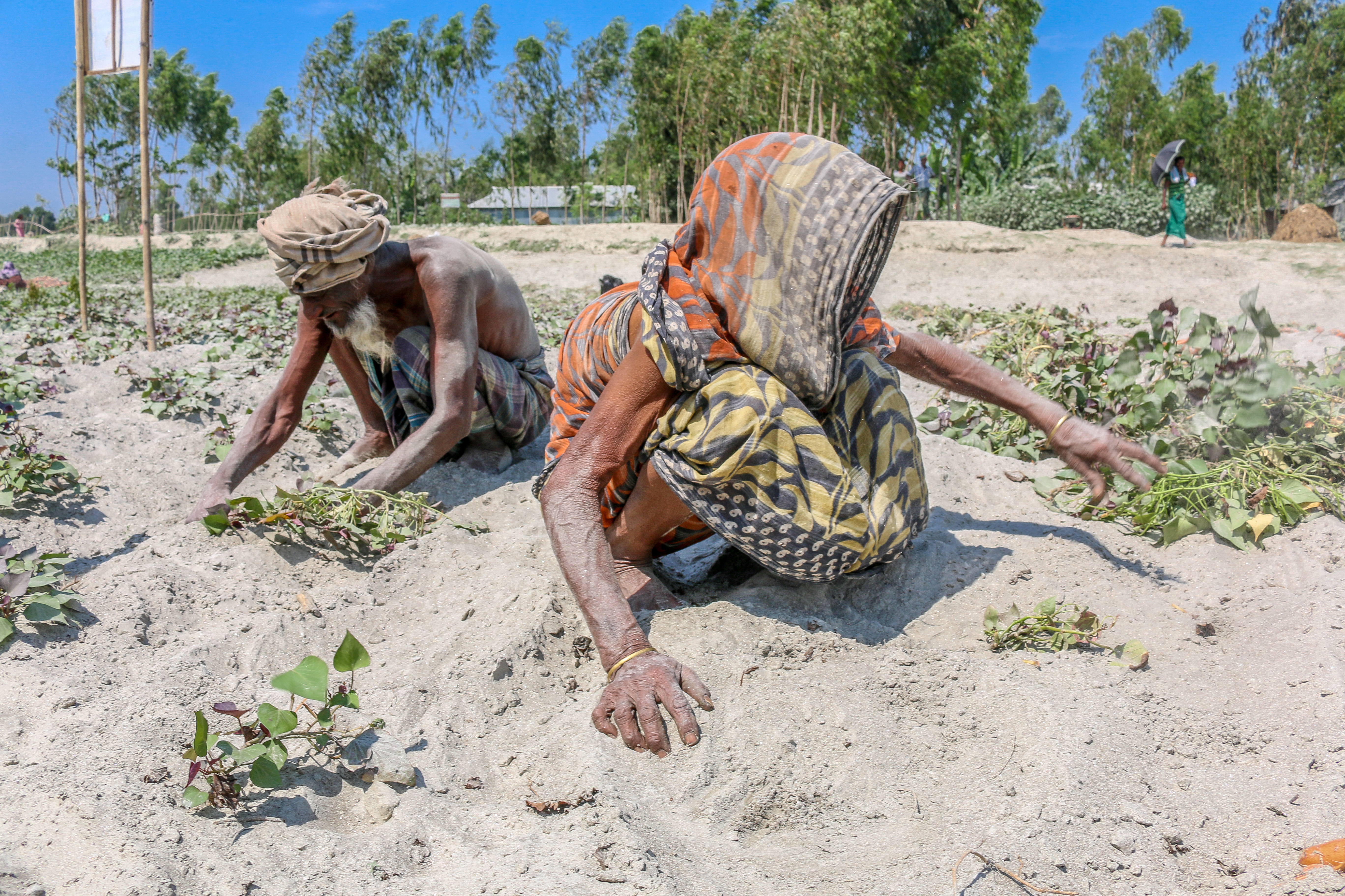 Life in the chars is both hazardous and insecure. Many char dwellers struggle to produce or buy enough food to eat and malnutrition and micronutrient deficiencies are common in these areas. And so it is with these communities in mind that the International Potato Center (CIP) along with local partners such as Bangladeshi Agriculture Research Institute (BARI) and BRAC are introducing orange fleshed sweetpotato as a resilient and nutritious food crop. Living in one of the most extreme environments in the world, these farmers live with the daily threat of flood, erosion and drought and so providing access to a crop which could provide both economic opportunities and nutritional benefits is a potential game changer for some of these farmers.