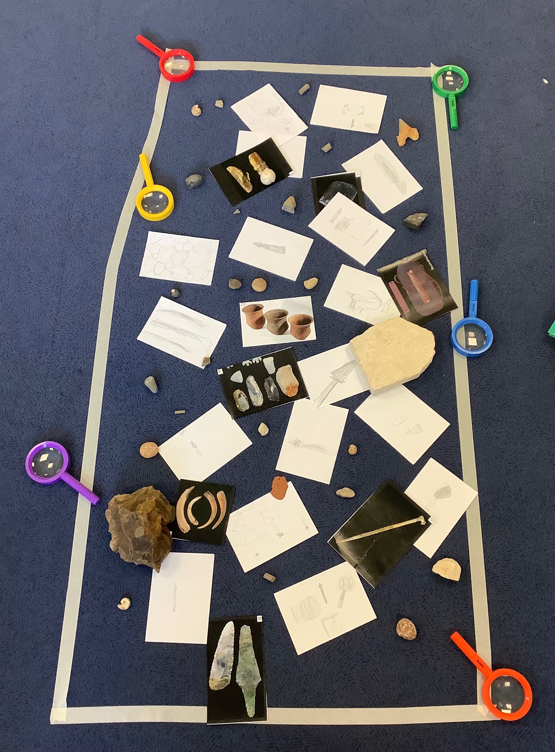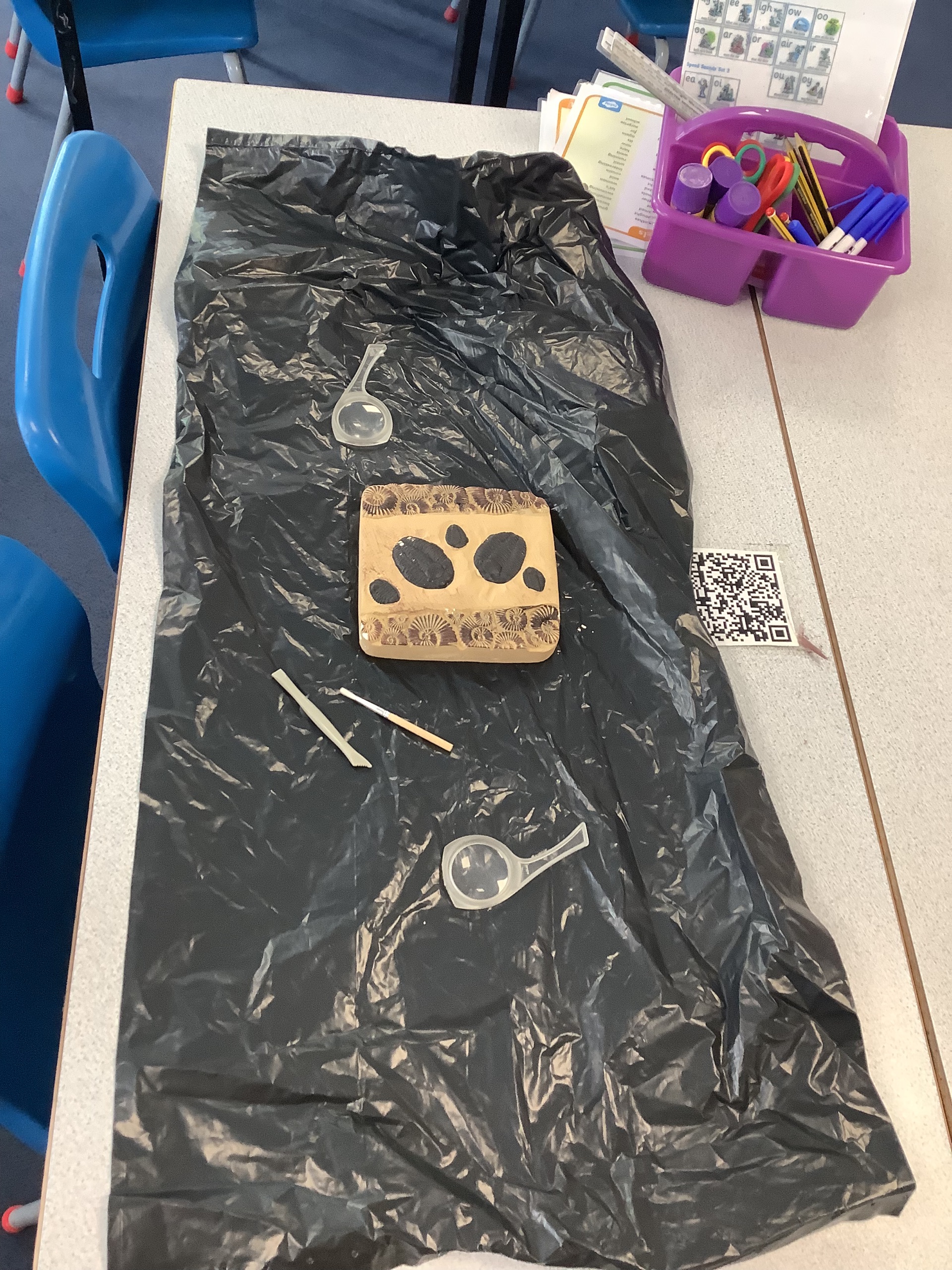 The excavation site had been laid out for the class for when they came back from break time. They firstly had a little explore of the site on their own, using the magnifying glasses. There were some fantastic conversations occurring as they investigated. We then came together as a class to go through the different activities.