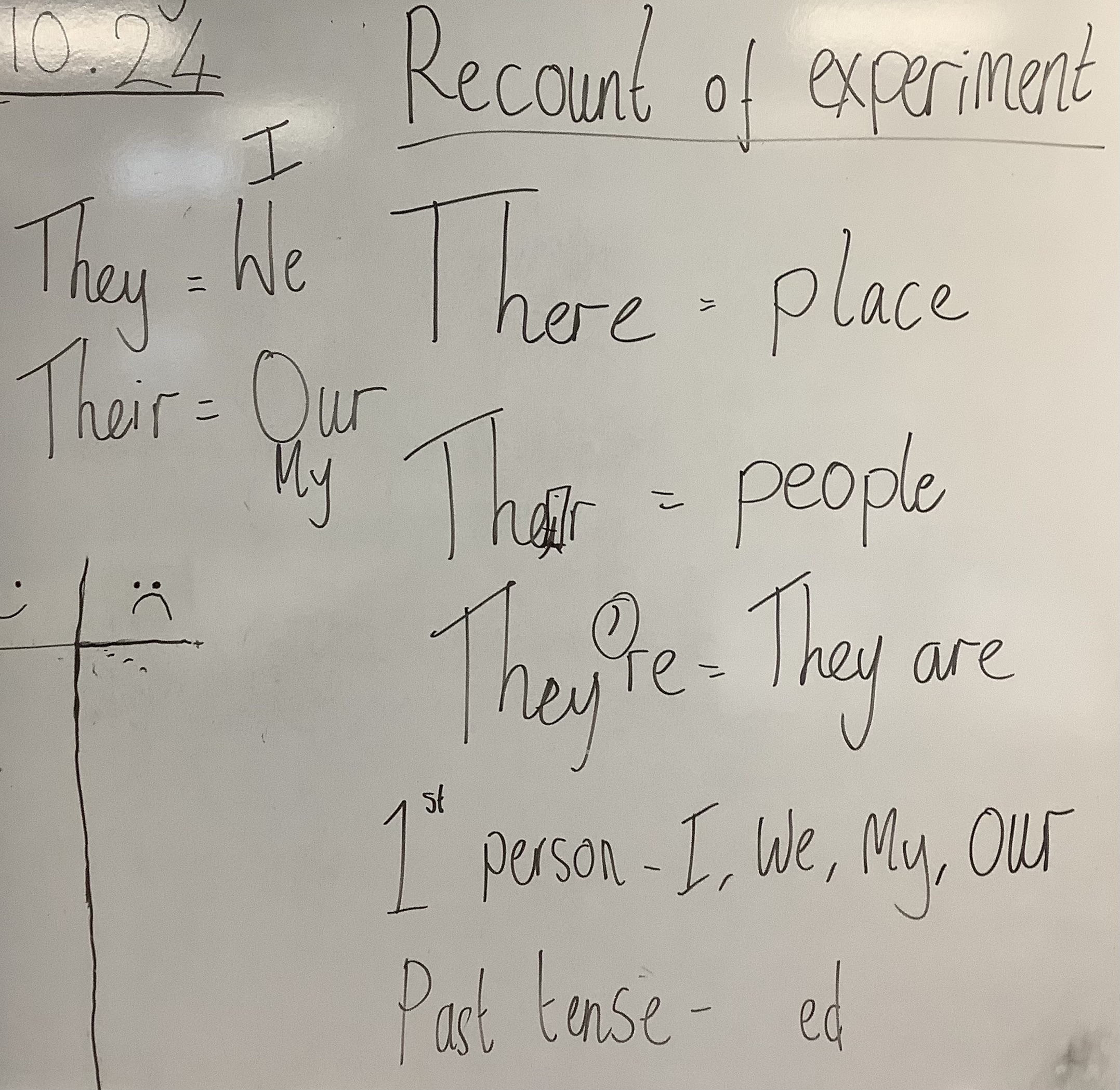 As part of our English lessons this week, we were learning about recount writing. By the end of the week, we wrote a recount of our most recent science experiment. Firstly we wrote one as a class in third person. Then the children worked in different groups to rewrite the recount in first person.