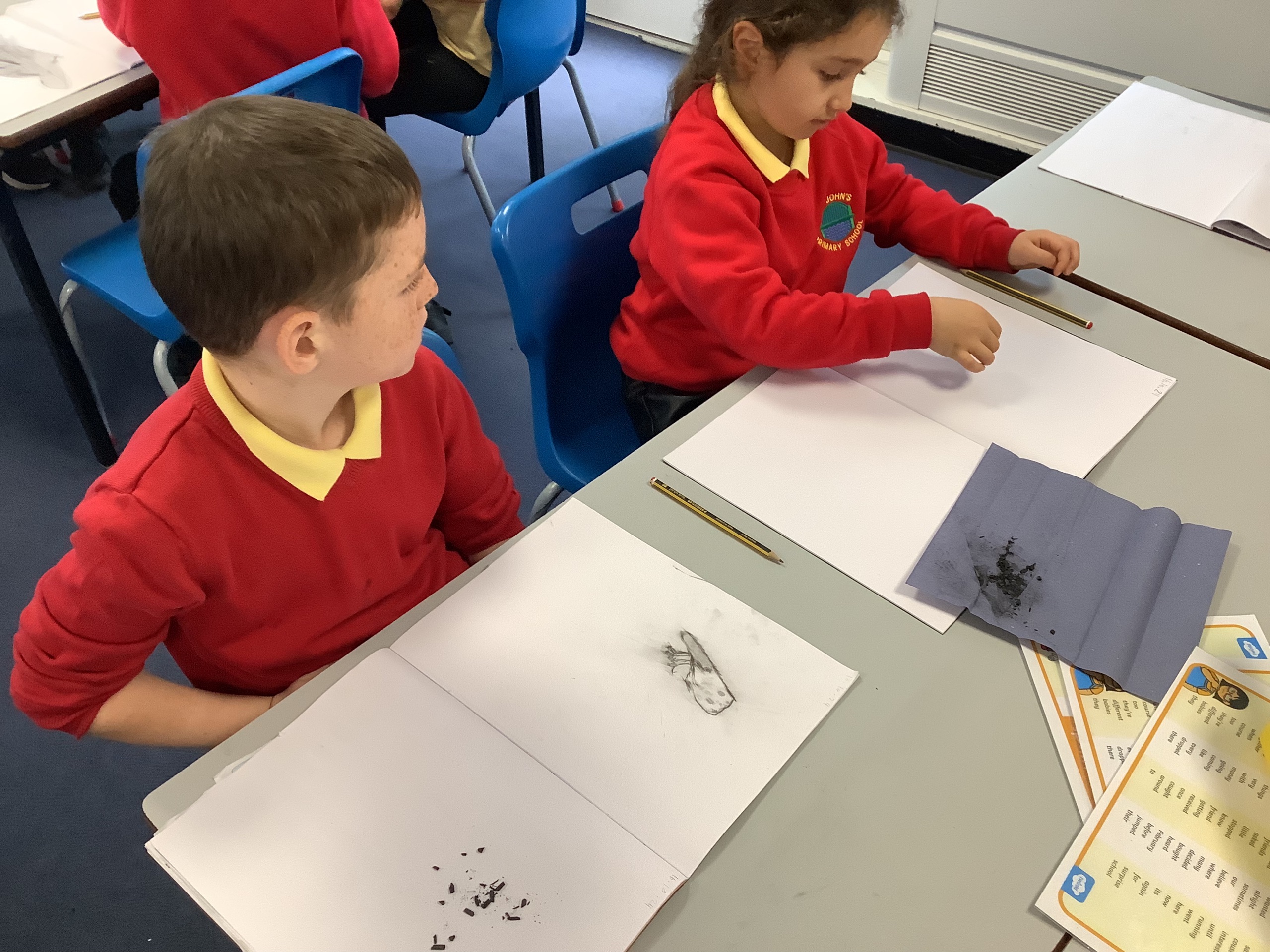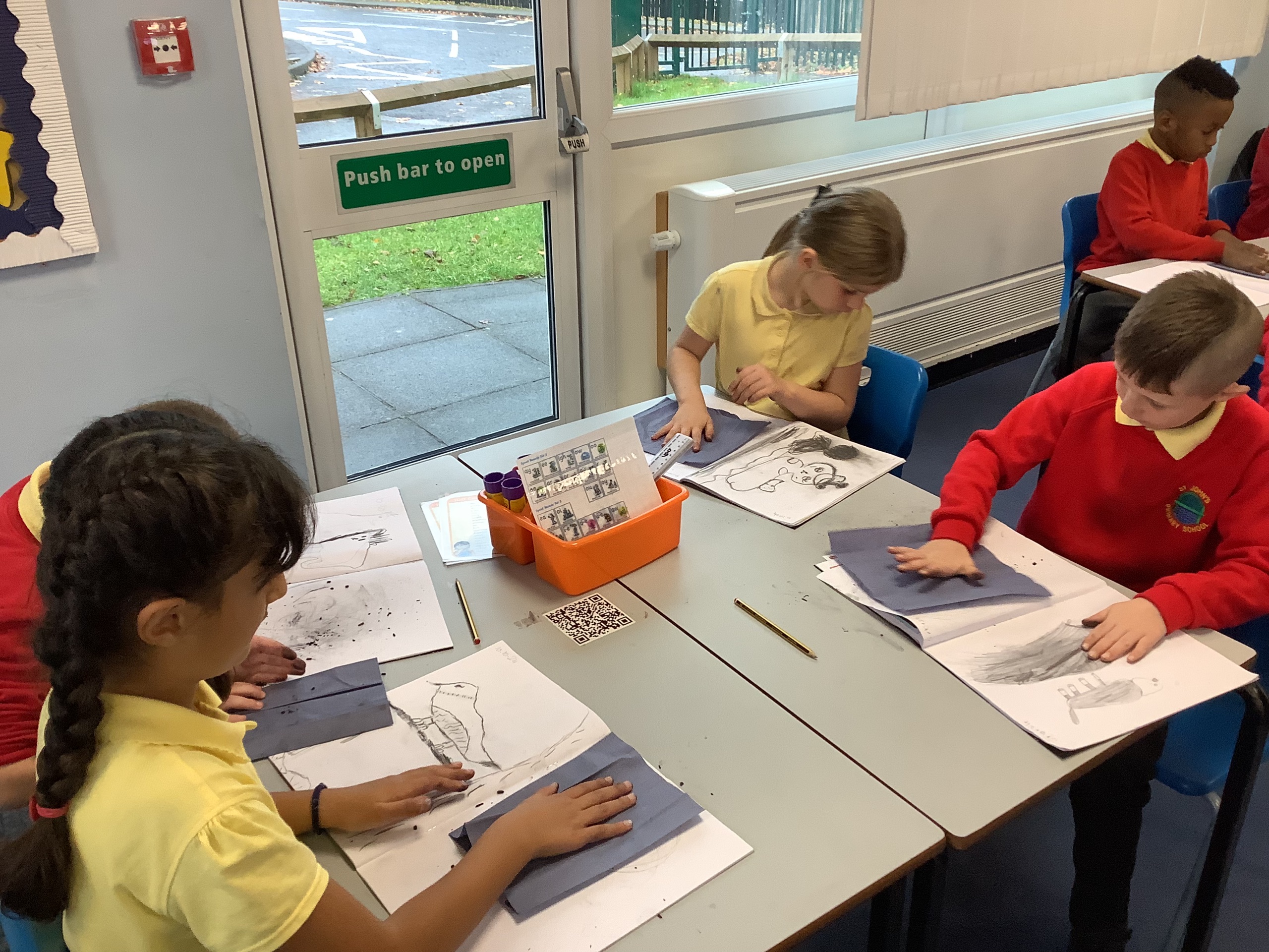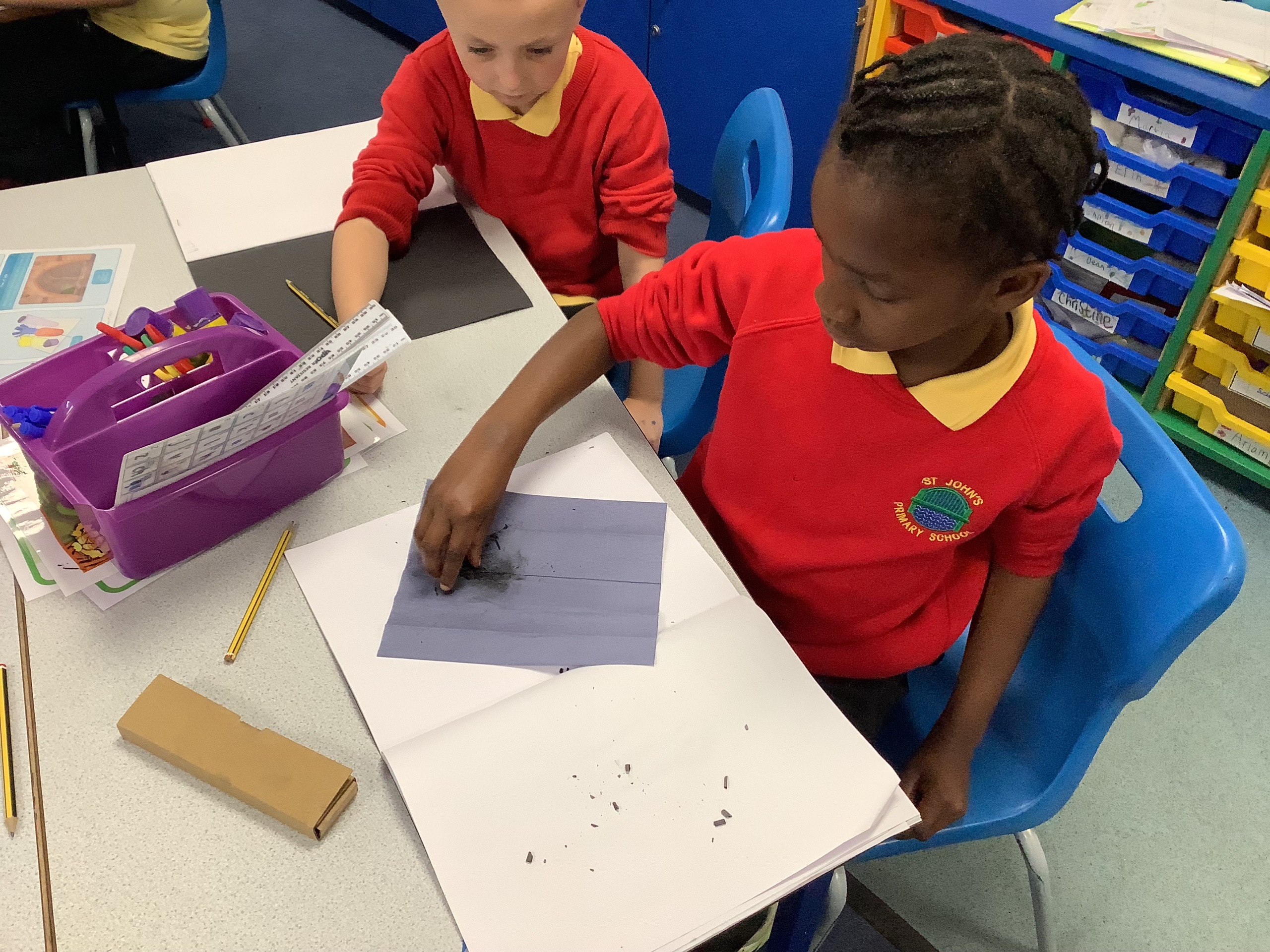 Firstly, the class used charcoal to create a background in their sketchbook. They had to grind the charcoal up into a powder and then spread it across their page.