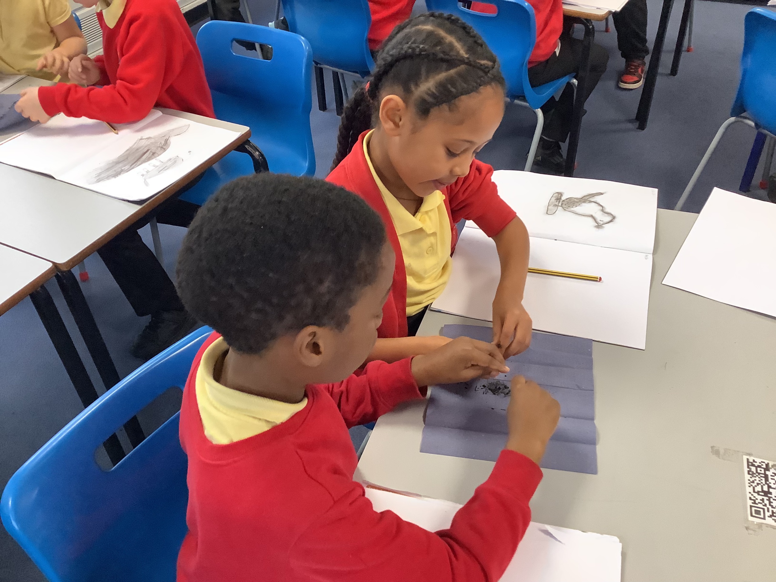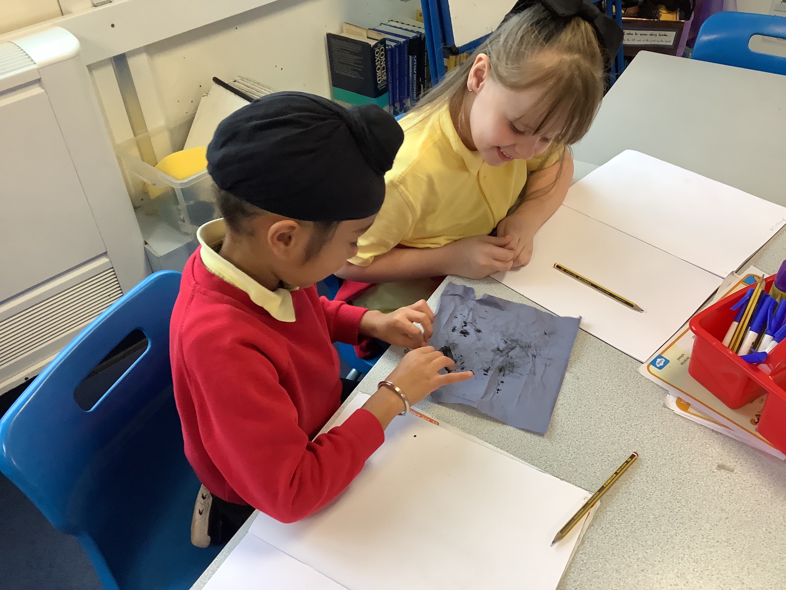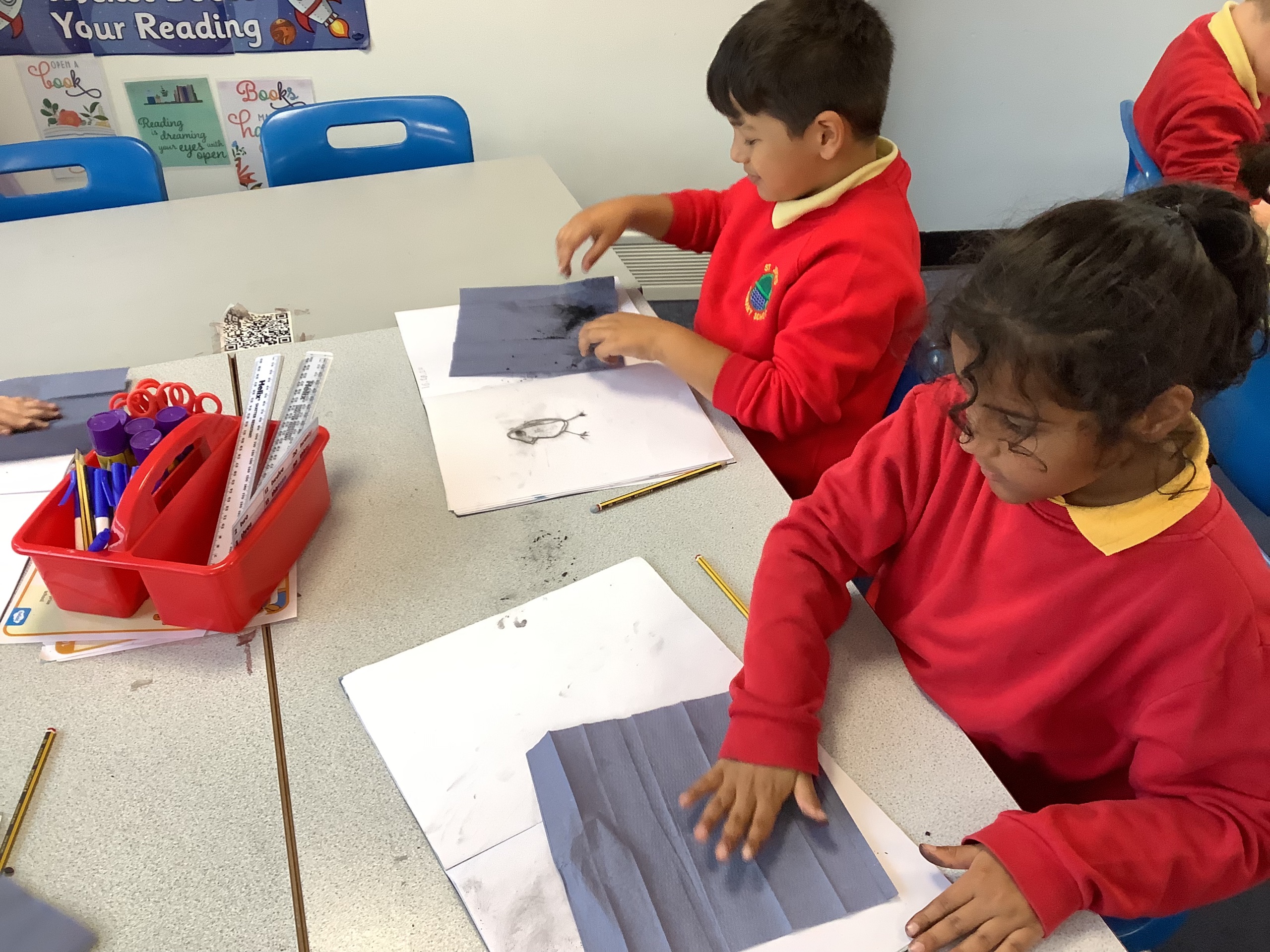 Firstly, the class used charcoal to create a background in their sketchbook. They had to grind the charcoal up into a powder and then spread it across their page.