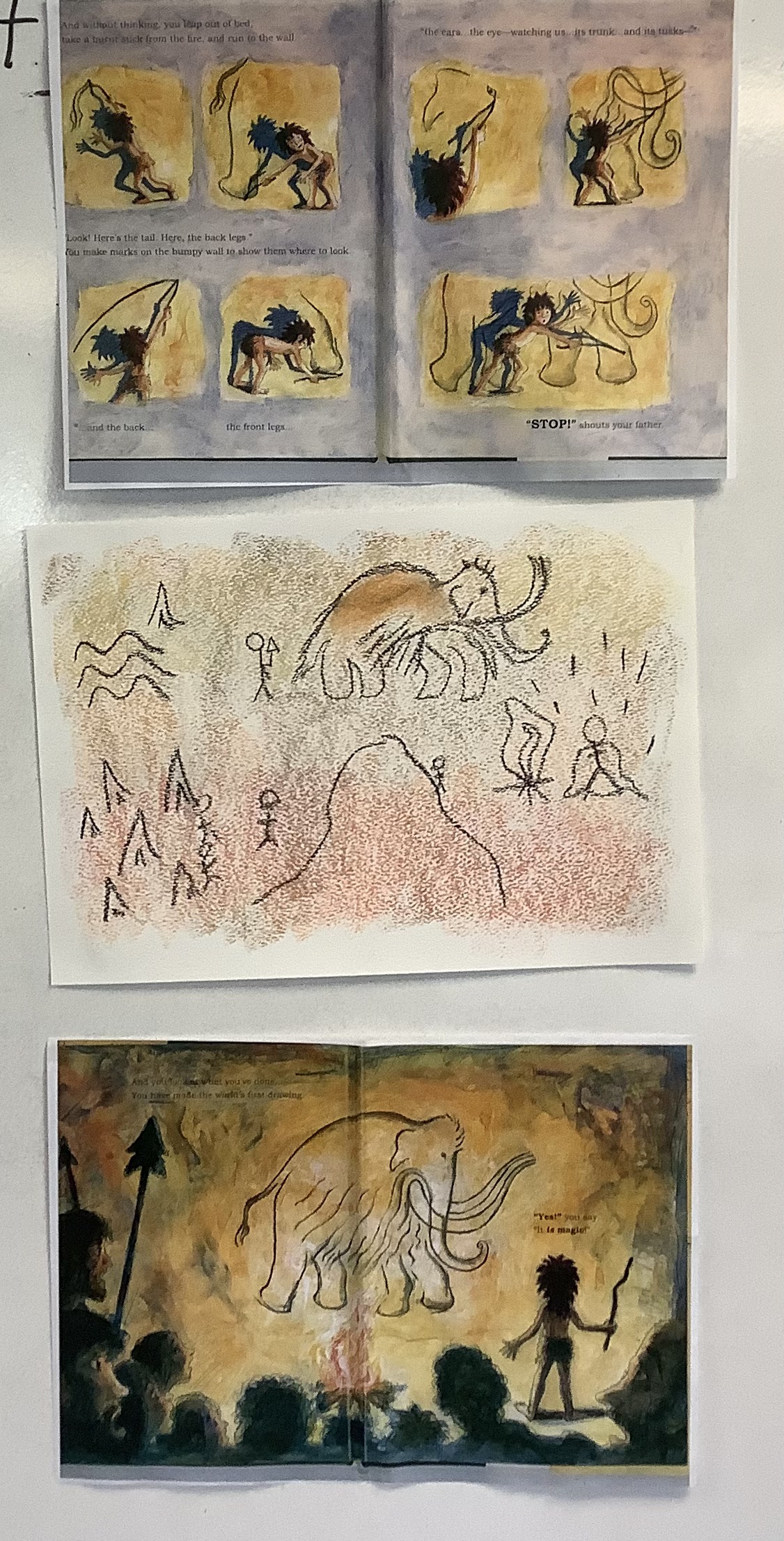 While we let our backgrounds, the class drafted their cave painting story in their sketchbook. Everyone followed the story of our journey but could put their own spin on it!