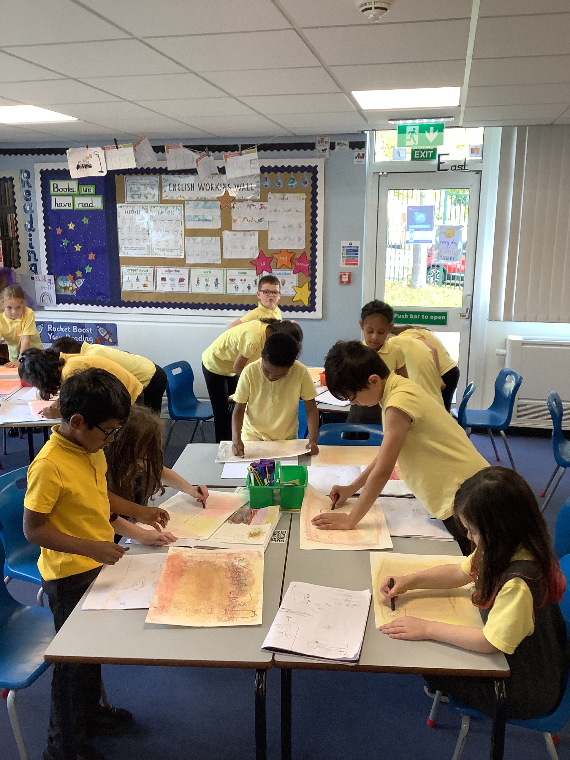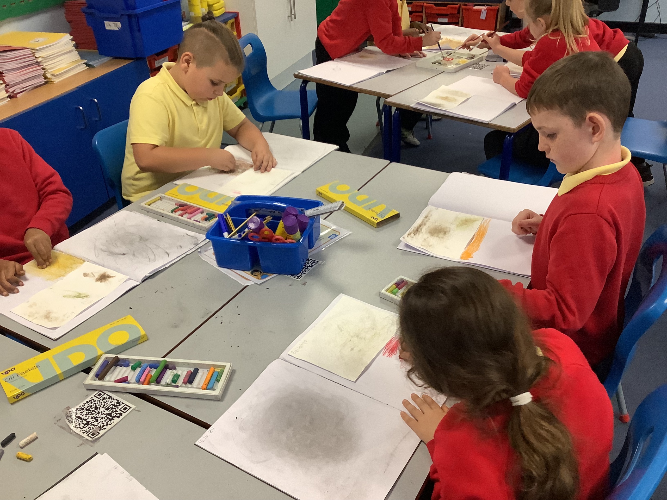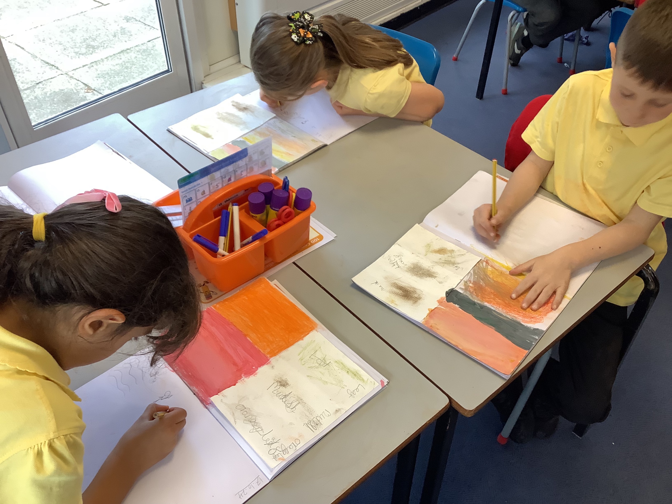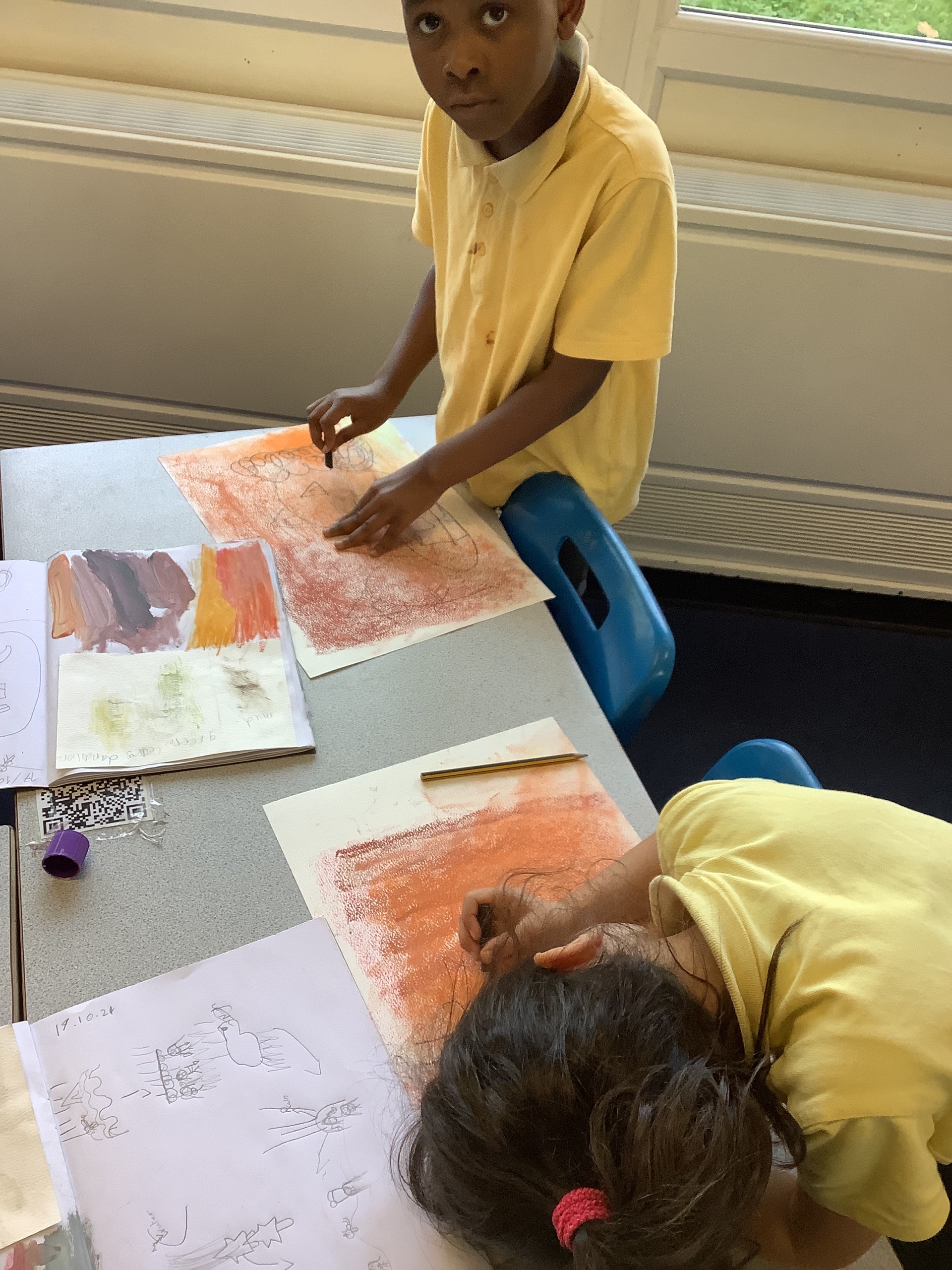 The next lesson, everyone spent time using paint and oil pastels to create natural colours. This was an experimental process to see what worked well as a background colour.